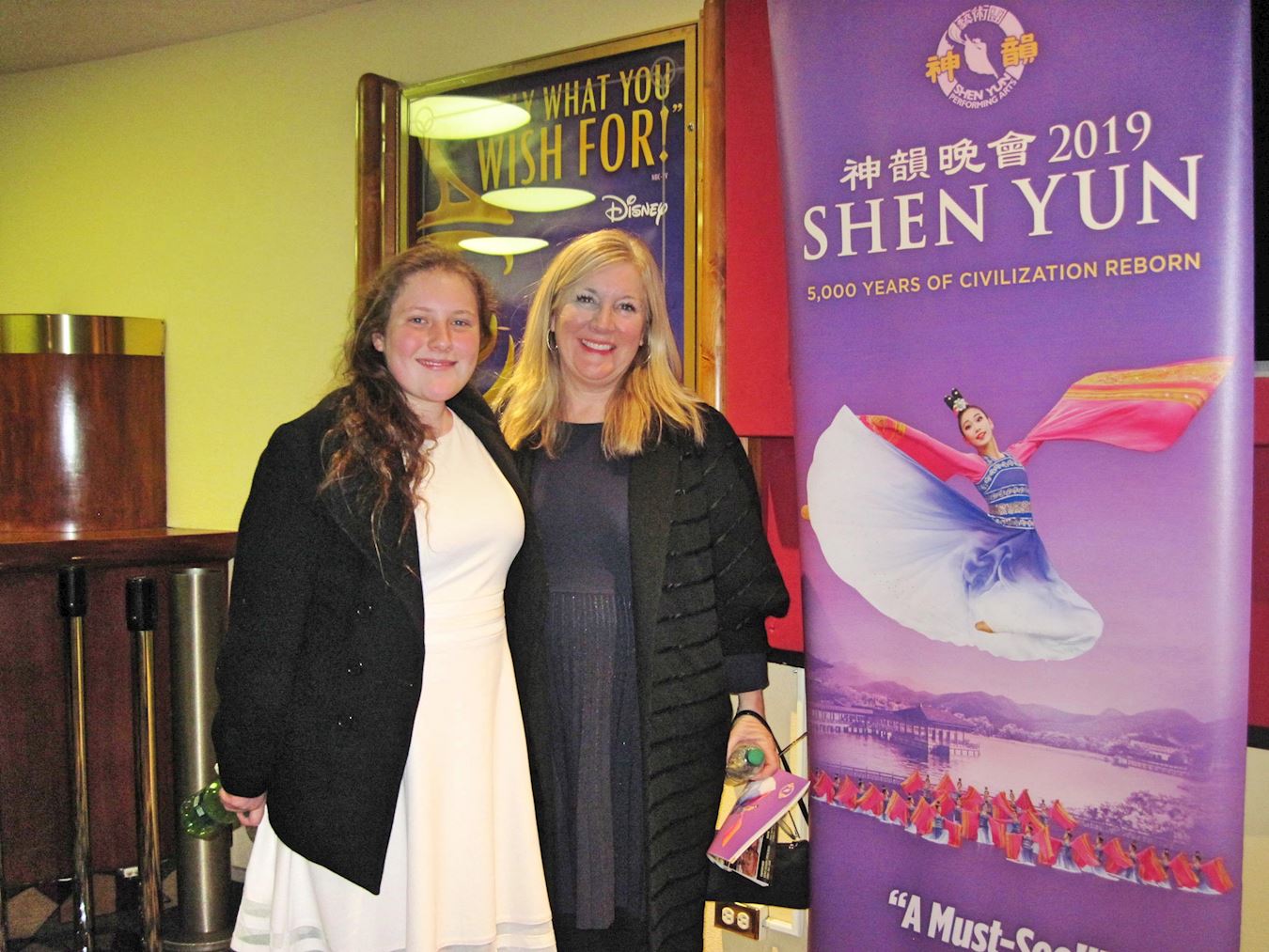 芙罗女士表示,神韵票是给女儿的圣诞礼物。女儿索菲亚·卡普脸上洋溢着幸福、陶醉的笑容。年仅十三岁的索菲亚是一位演员,目前正参演好莱坞音乐剧《少男少女》(“Guys and Dolls”)。她说:“神韵非常美!让人感到似乎是在飘着云彩的天空中观看演出。非常美好。”