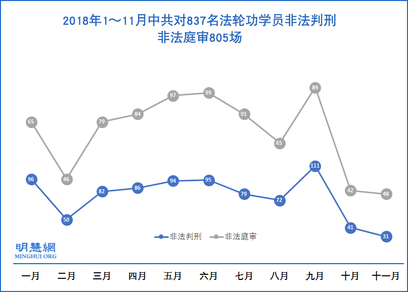 ![]() 图1:2018年1~11月中共对837名法轮功学员非法判刑,非法庭审805场 |