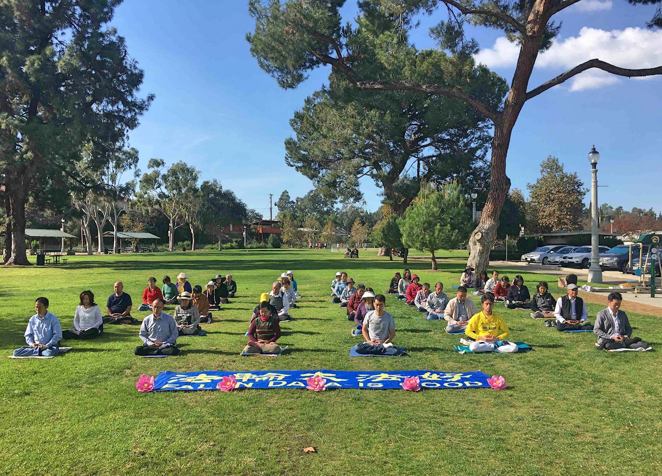 ![]() 图1:当天清早,法轮功学员在圣盖博市的文森特卢果公园(Vincent Lugo Park)里集体炼功。 |