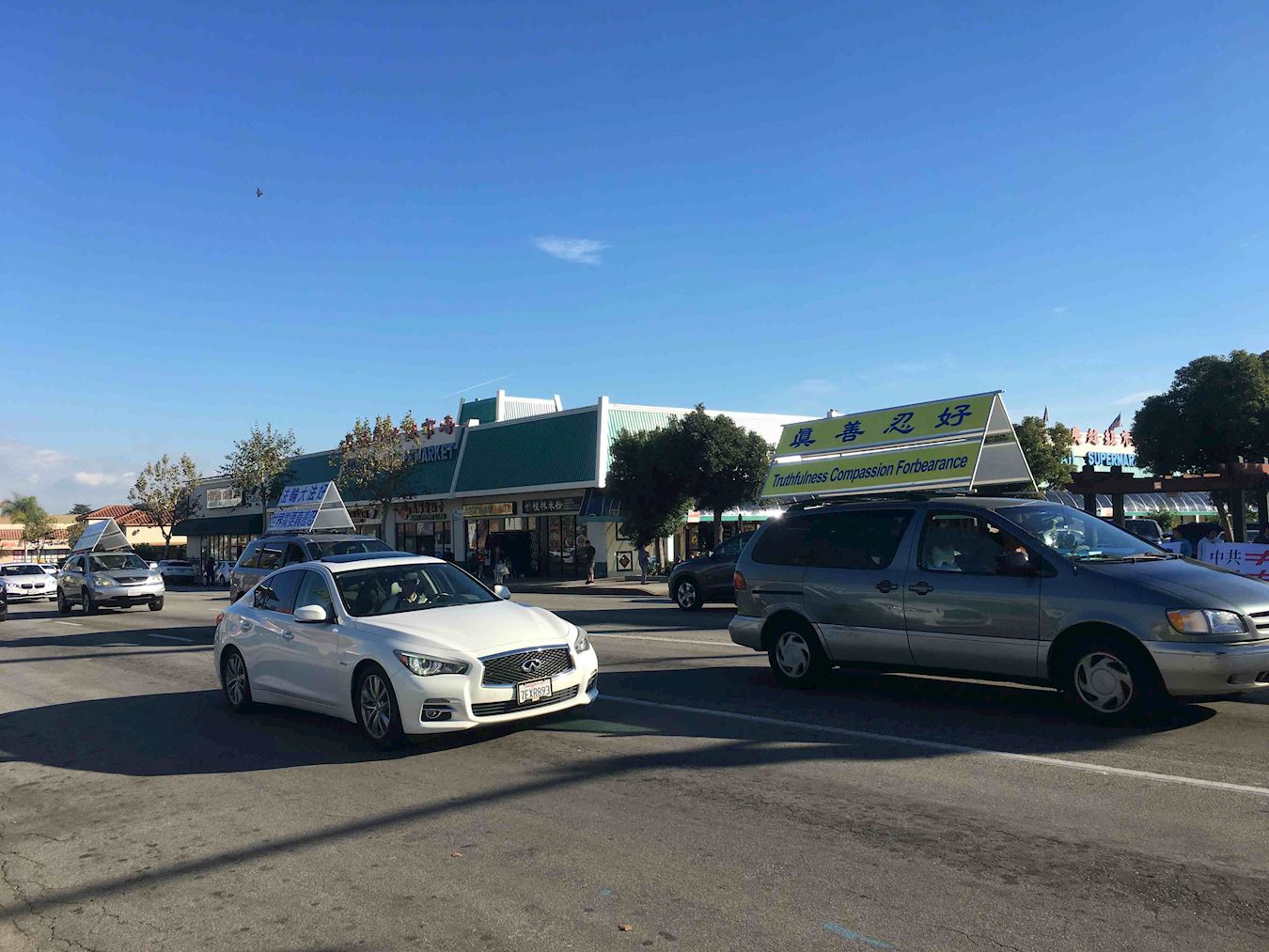 ![]() 图2~6:随后,法轮功学员在华人聚居的圣盖博市(City of San Gabreil)山谷大道(Valley Blvd.)筑起“真相长城”,吸引过往车辆和民众的目光。 |