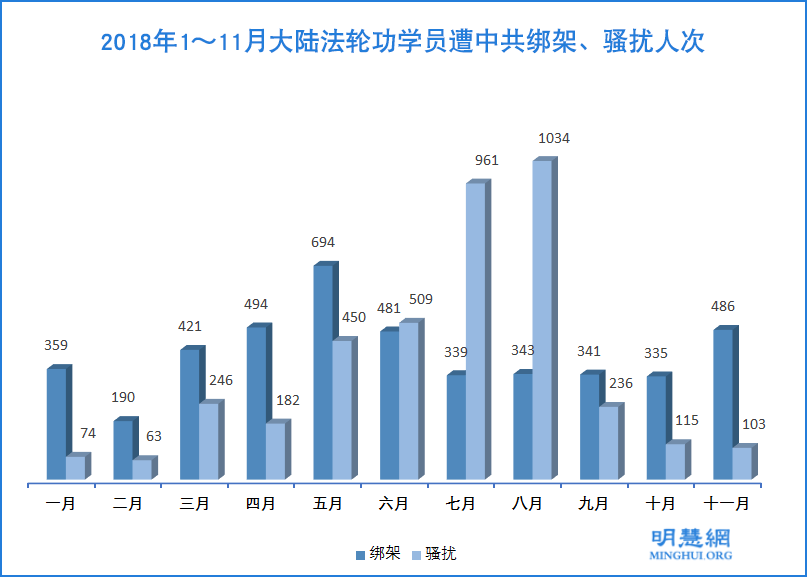 ![]() 图2:2018年1~11月大陆法轮功学员遭中共绑架、骚扰人次 |