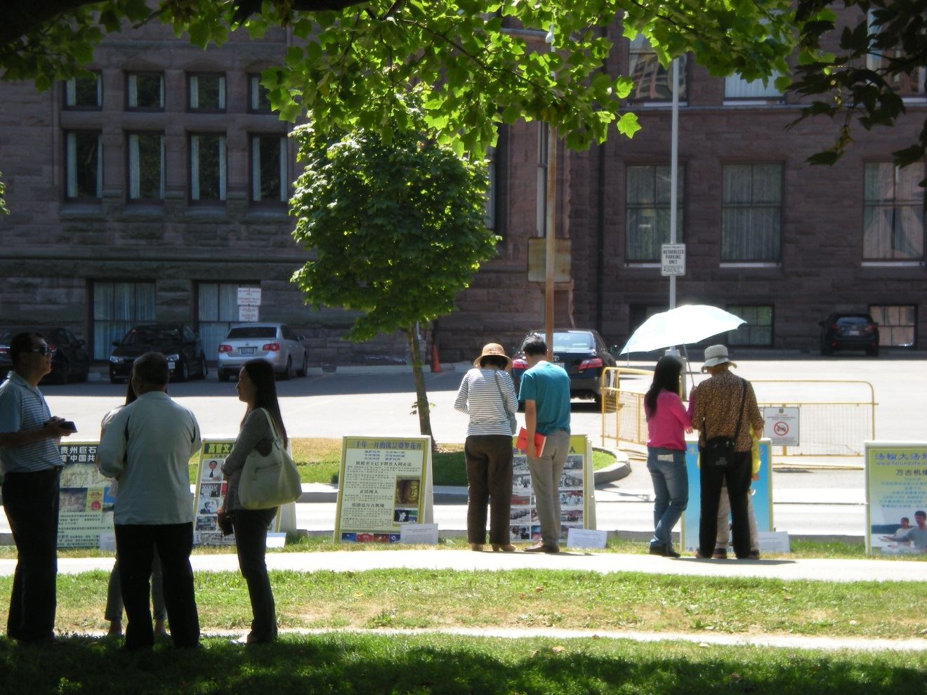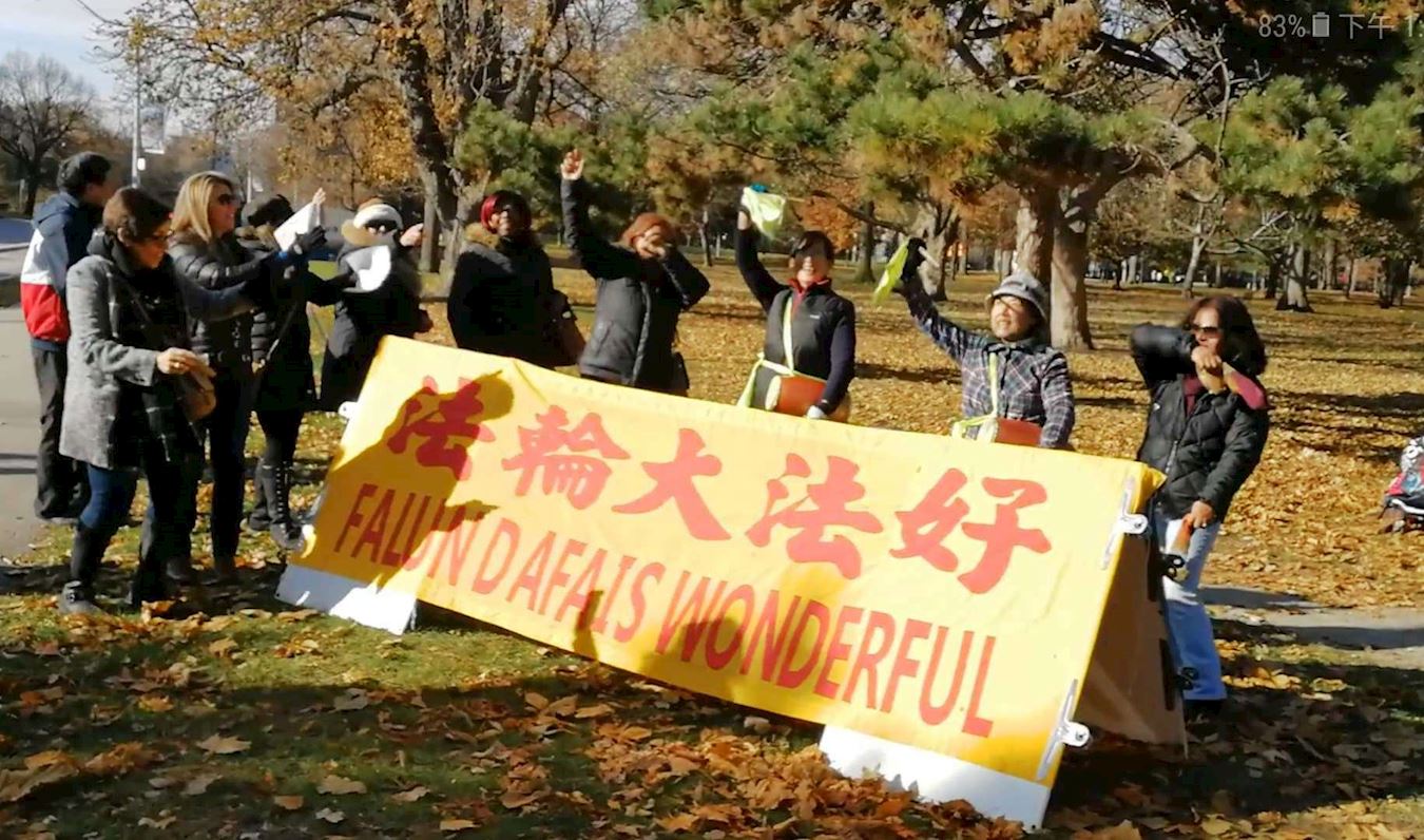 十年如一日地坚持面对面讲真相劝三:退.(退出中共党团队,简称三:退.)的学员,一年四季奔波在风雨中坚持讲真相。有一个老年人学法小组有很多都是有二十多年修炼历程的老学员,二零零五年之前相继来到多伦多,这些八十岁上下的老学员个个都很精神,她们做横幅,制作真相版,什么都能做,大家在集体学法交流中,共同悟到了我们的使命是建立真相点,在第一线讲真相,过程中坚定地走出了一条自己的路。比如皇后公园、电视塔、中国城唐人街、安大略码头湖边等多个地方都是大家共同开创的讲真相点,他们非常珍惜在真相点遇到的每位游客。