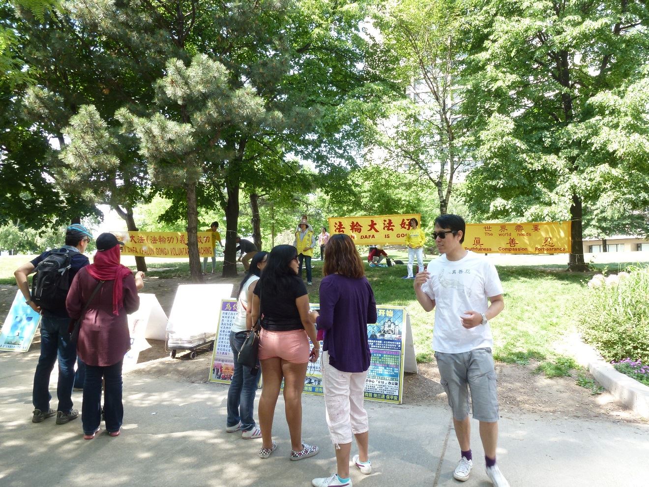 刚开始,他们从一辆旅游大巴士下来,法轮功学员张女士迎上去递给他们资料,王先生指着法轮功学员对他儿子说:“快看看,这就是你在国内听说的法轮功,是被人洗了脑,精神不正常的人。”孩子于是很天真地看着法轮功学员。