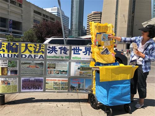 这位先生点着头,然后指着手上的资料说:“那这是怎么来的?”麦女士回答说:“这个我很清楚,印刷费0.25元一本,很多法轮功学员身心受益后把自己省吃俭用的钱拿出来做材料,或拿出自己的时间和收入制作光碟、传单等真相资料,与大众分享信息。海外法轮功学员都是如此。”