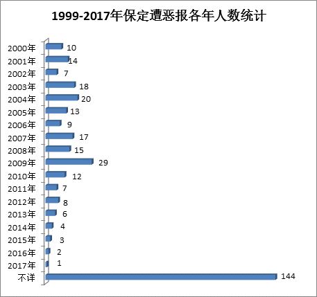 表1显示:2000年遭恶报的有10人,2001年遭恶报的有14人,2002男遭恶报的有7 ,2003年遭恶报的有18人,2004年遭恶报的有20人,2005年有13人,2006年9人,2007年17人,2008年15人,2009年29人,2010年12人,2011年7人,2012年8人,2013年6人,2014年4人,2015年3人,2016年2人,2017年1人,年代不详的有144人。