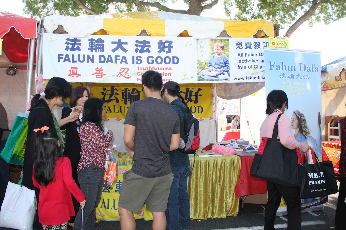 摊位整洁祥和的环境、慈悲悠扬的音乐,吸引了很多民众前来了解真相,有多人当场请购法轮功书籍、询问教功录像光盘,想要学炼法轮功,法轮功学员告知了他们炼功点和学炼法轮功免费九讲班的信息。