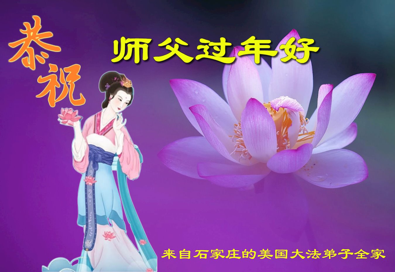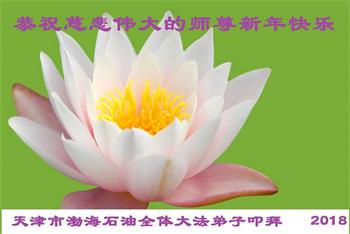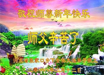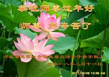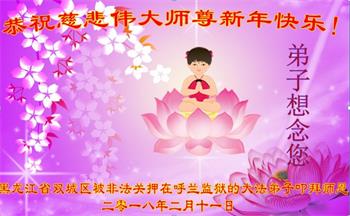 辽宁省锦州市凌海市一大法弟子的家属说:“师父:弟子代表全家及所有的亲属和周围明真相、做三:退.的世人给您拜年,感恩师父佛恩浩荡。我们每个人都在大法中受益无穷,法轮大法的美好与神奇,使越来越多的人诚信与敬佩,说不完,道不尽。”