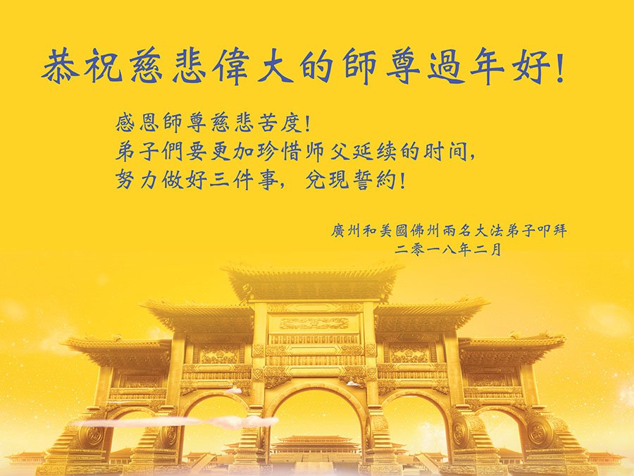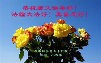 【明慧网二零一八年二月十六日】中国新年之际,来自美国纽约、大费城、拉斯维加斯、旧金山、肯塔基、洛杉矶、旧金山、匹兹堡、堪萨斯州、俄亥俄州、南卡莱罗纳、圣地亚哥、圣荷西、波士顿、麻州、康州、波特兰、芝加哥、爱荷华州、内不拉斯加、阿肯色等地的大法弟子恭祝师尊新年好!