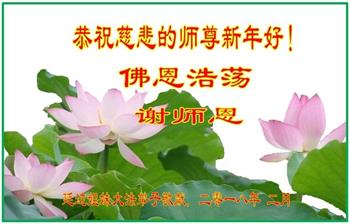 谢谢师尊的慈悲苦度,师尊辛苦了!在新的一年里,弟子们一定听师尊的话,做好三件事,多救人,遇事向内找,做一个合格的大法弟子,圆满随师还。