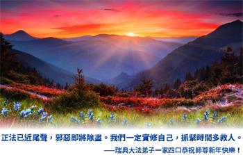 在新的一年里,我们一定遵照师尊教诲,更加精進,多学法,学好法,遇事向内找,实修心性,密切配合,相互包容,做更多更好的各种精美的真相资料,多救人,走好最后的路,完成史前大愿,让师尊多一些欣慰,少一些操劳。