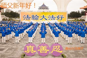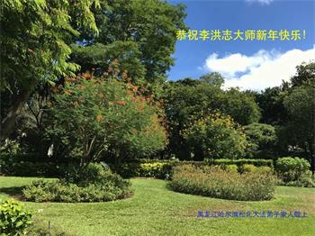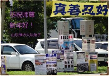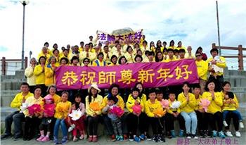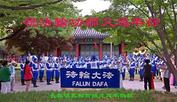 这天风和日丽,阳光普照,色彩亮丽的祝贺布幕下,法轮功学员整齐列队。腰鼓队向师尊敬献的表演拉开了祝贺集会的序幕后,学员们恭敬合十,齐声念诵:“师父您好!师父过年好!”“恭祝师父新年快乐!”随后几位天真烂漫的大法小弟子站到祝贺阵列前恭祝师尊新年快乐。之后众人齐唱《谢师恩》、《惟愿师尊笑》、《法轮圣王》、《福》、《法轮大法好》等歌曲,在高举福字帖的欢乐气氛中,活动圆满结束。