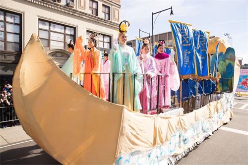 “全球.退:党!服务中心”的大型横幅在前,双狮开道,退!党!彩船乘风破浪。一支长约十米的黄色月牙形的大船,船身是蓝白相间的祥云彩图,船头是天宫仙境中的亭台楼阁,船上站着身穿锦衣罗裙的“天女”;最醒目的是船上六面导航的蓝色大幡旗,旗帜上的金色大字 “退!党!”在阳光下熠熠生光。