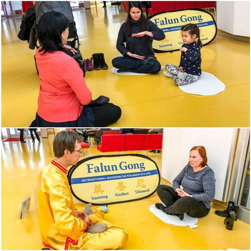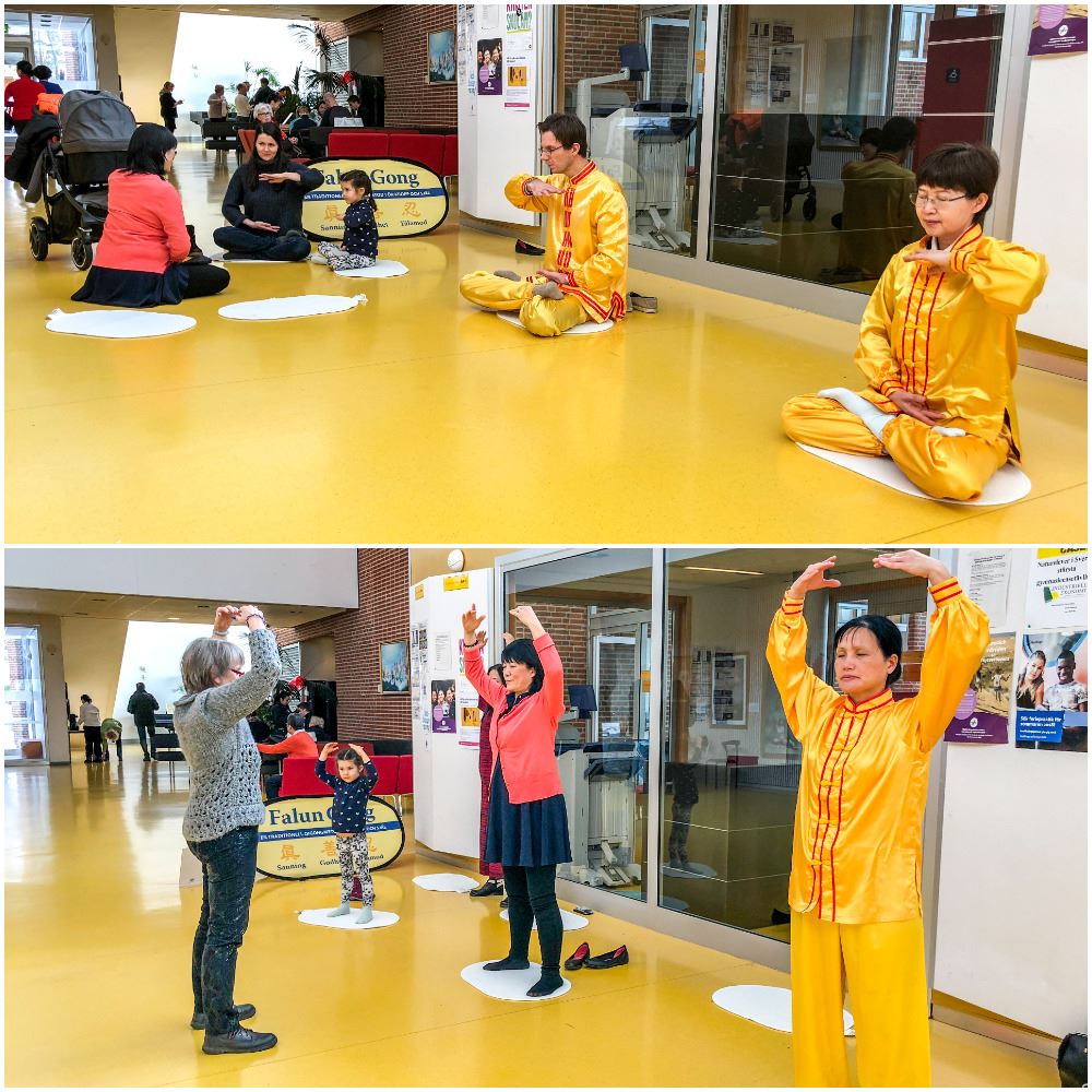 ![]() 图2~3:二月十七日,真善忍美展最后一天是大年初二,法轮功学员在东部高中大厅里,演示法轮功的功法,并义务教功,给瑞典民众讲真相、送祝福。 |
