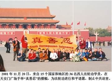 二、再说一个大家所熟知的画面,就是多位西人同修在天安门手举横幅的合照。从当时的录像看,在他们坦然相聚一起,举着横幅,立掌发正念时,周围的警车、警察迅即围拢了过来,在这历史的瞬间,留下了这张可贵的照片,见证了西人同修,为制止这场迫害,跨越千山万水,无私无畏,放下自我,融入正法的足印,让人们看到了世界同修是一个整体,一个反迫害救众生的整体。