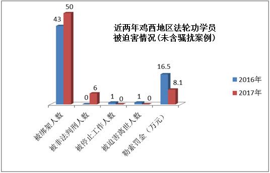 而在二零一六年,鸡西地区法轮功学员遭绑架的至少有四十三人次,一人被迫害离世,有一人被停止工作,共被勒索钱财十六万五千元,还有更多法轮功学员遭酷刑冤狱的事实被曝光。