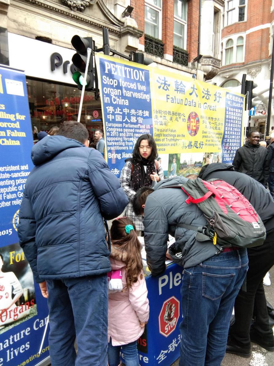 而今天,遥遥更加开心,因为今天有五百多人签了名字,他们都对中共的迫害说“不”。但一些中国游人仍对法轮功有误解。无论是剑桥大学还是大英博物馆,唐人街,许多中国人见到法轮功学员的展位,不敢靠近,有的直接远远地躲开;有的站在远处看展板,不敢和学员说话。跟别的国家的人有明显的反差。遥遥说这就是中共对法轮功丑化宣传,仇恨宣传,恐惧宣传的结果。这更告诉我们坚持讲真相的必要。我们相信中国人也和其他国家的人一样善良,也会对中共迫害善良人说“不”。希望他们能早日摆脱中共邪教的思想控制,不要被强加的仇恨宣传泯灭自己的良知,没有良知的人生是凄惨的,我们希望人人都有一个美好的未来。