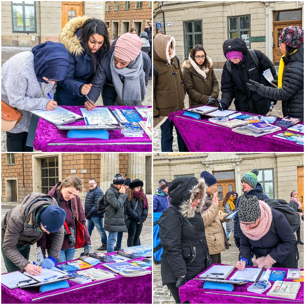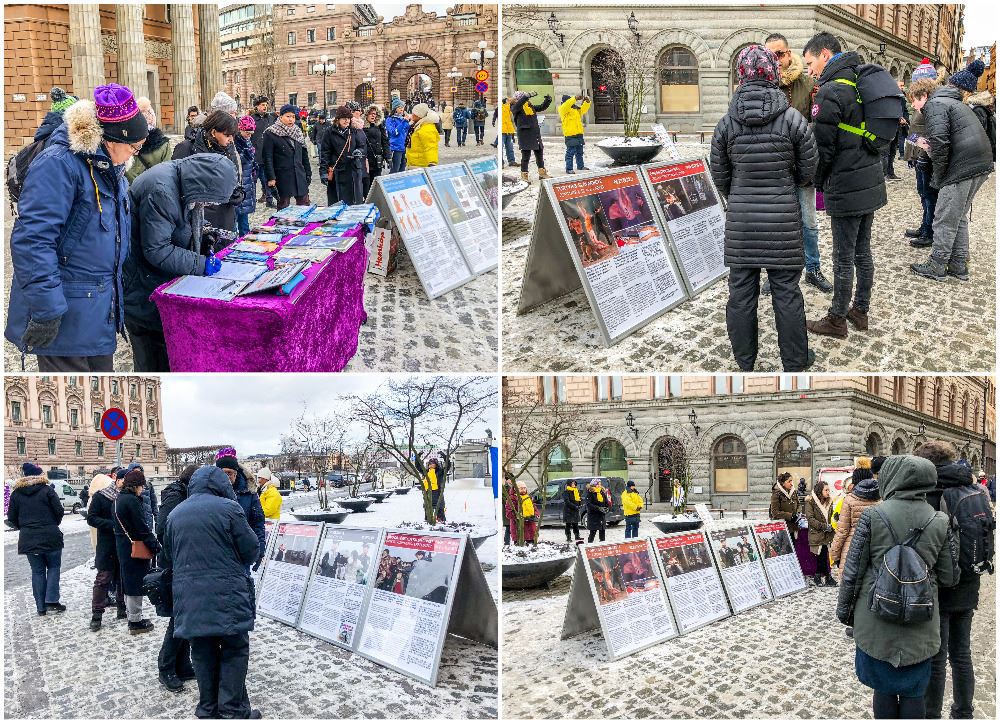 二月二十四日这天中午,阳光明媚,但连续几天的低温加雪,斯德哥尔摩的气温低至摄氏零下十度。法轮功学员们冒着严寒在市中心皇宫旁的钱币广场上,竖起“停止迫害法轮功”的横幅,摆上真相展板、伴随着悠扬的炼功音乐向人们展示功法,同时向来往的行人发放传单、讲述法轮功在中国无辜遭受迫害的事实真相,并为制止中共活摘法轮功学员人体器官而征签。