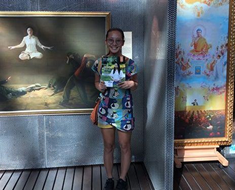 台湾游客丽禹正在墨尔本度假,非常享受画展带给她的美好。“我看到一幅作品中,黑暗中有微微的光透出来,很吸引我。跑过去一看,才知道是讲法轮功的事情。身为一个台湾人,其实还蛮有共鸣的。在台湾的各个景点,每次看到法轮功学员,我都有种亲切感。”