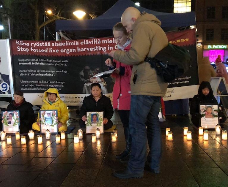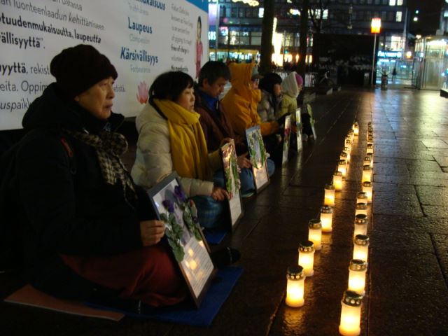 '图1-2:芬兰法轮功学员在首都赫尔辛基市中心点起烛光,悼念被中共迫害致死的中国大陆同修'