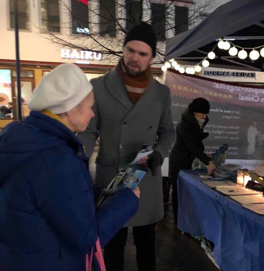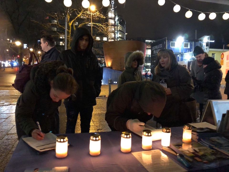 【明慧网二零一八年二月四日】每年的一月二十七日是为纪念二战时被迫害致死民众的受酷刑者纪念日。二零一八年的这一天,芬兰法轮功学员在首都赫尔辛基市中心点起了烛光,悼念那些在中国大陆被中共迫害致死的法轮功学员。烛光映照着遇难者的遗像,伴随着悲壮的音乐,很多路人受到触动,走近来了解详情。