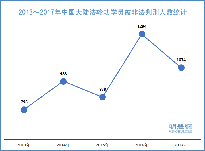 ![]() 图1:2013~2017年中国大陆法轮功学员被非法判刑人数统计 |