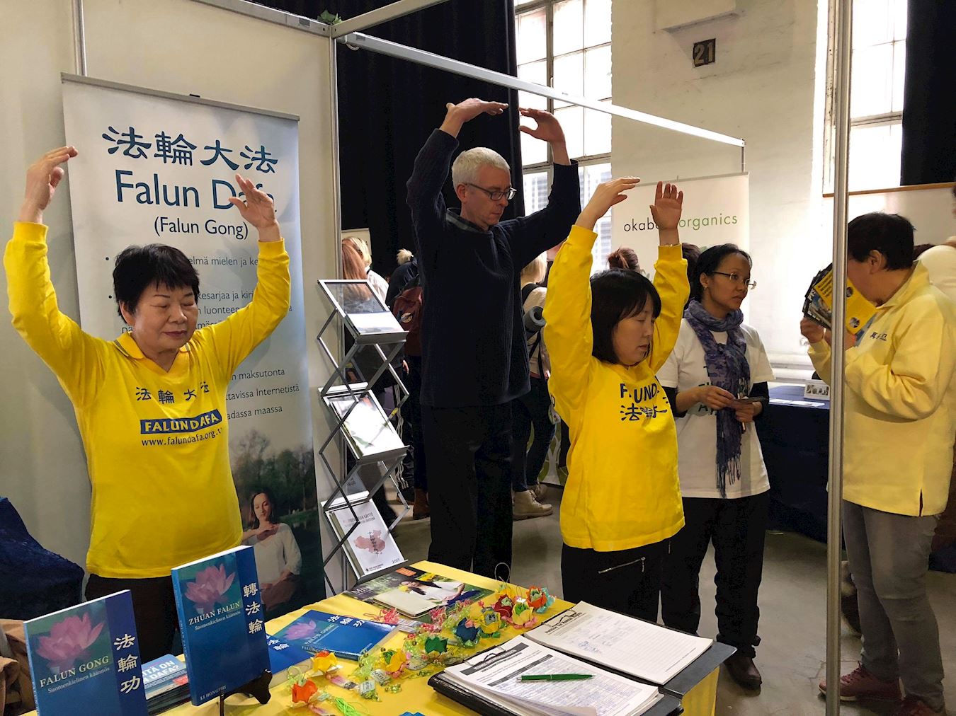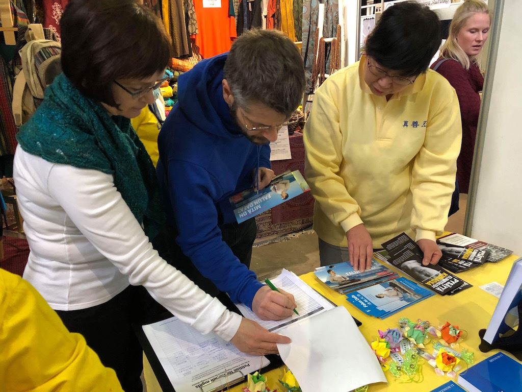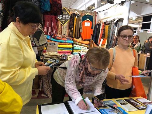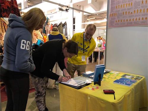 很多人经过法轮大法的展位时,都被祥和的气氛所打动,静静的看着功法演示。当芬兰人得知这么祥和的功法竟然在中国是被禁止的,甚至学员因为不放弃而遭到迫害,他们很难想象,也很难相信这一切都是真的。但是经过学员耐心的讲解,都明白了真相,也用签名来支持学员的反迫害。
