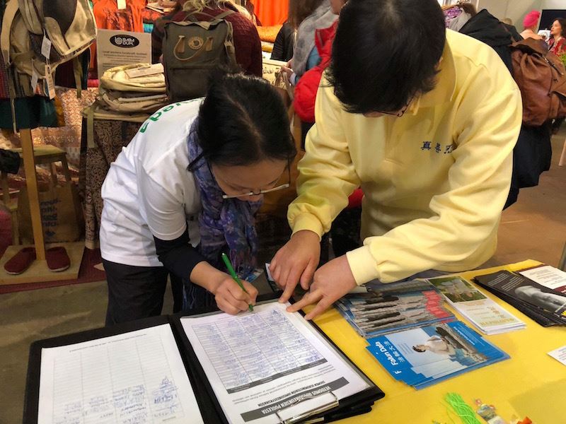 法轮大法的展位让很多路过的人感兴趣,有些人在前几届的展会上已经得到过大法的资料了,这次他们来专门签名支持法轮功学员反迫害。有位年纪大的女士以前练过瑜伽,她看到法轮功第五套功法,想知道怎么样才能像学员那样平和的打坐那么长的时间,走前她询问了炼功点,她表示一定会去学功。