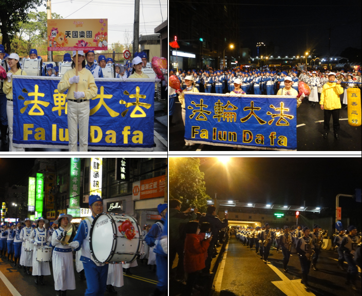 活动约于下午四点开始,藉由主广场舞台前的花灯与踩街竞赛揭开序幕,台湾天国乐团以《法轮大法好》气势磅礴的乐音,吸引现场观众的关注。紧接着是由五十七支队伍约一千七百人参加踩街游行。天国乐团是压轴队伍,游行间演奏《法轮大法好》、《法鼓法号震十方》、《神圣的歌》、《高山青》、《新年组曲》等悦耳的曲目。所经之处,壮阔的乐音吸引民众纷纷放下手边工作,驻足街道两旁,拿起手机拍摄这杨梅百年以来,元宵踩街首见的大阵仗。队伍的后头,由几位仙女提着“法轮大法好”与“真善忍好”的提灯,微笑向两旁的民众挥手致意,获得热情的掌声。有的观众拿起手机录摄天国乐团精神抖擞、英姿焕发的画面。