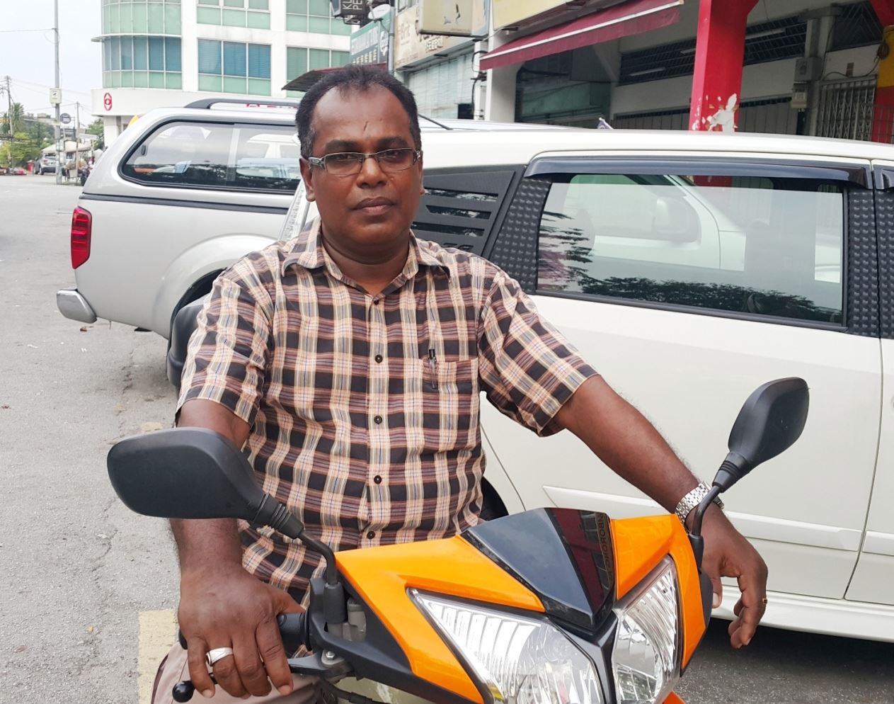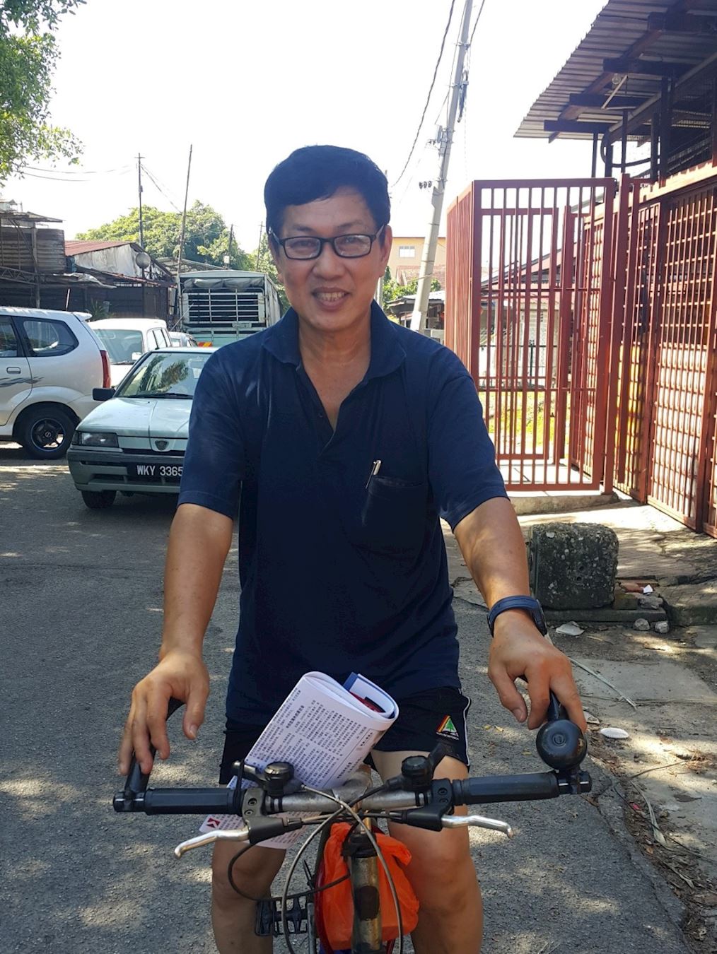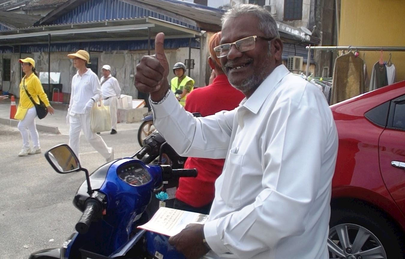 双溪比力新村民众Subramaniam 先生(57岁)兴奋地骑着摩托车追随着法轮功游行队伍,他竖起大拇指开心地表示:“很好!很好!第一次看到这样的游行!”