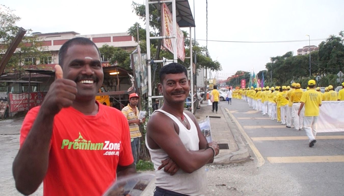 沙登新村印裔民众Raju先生与友人在路旁观看法轮功学员举办的新年游行,他开心地竖起大拇指,赞扬游行队伍很美。