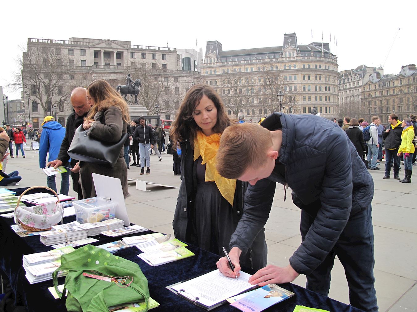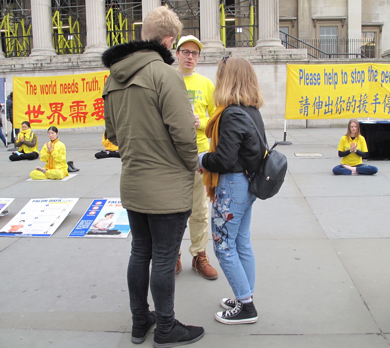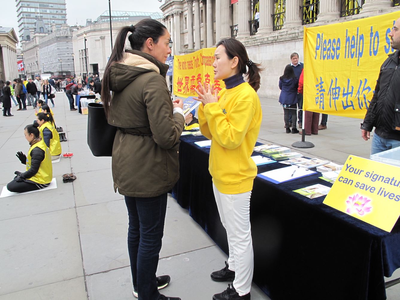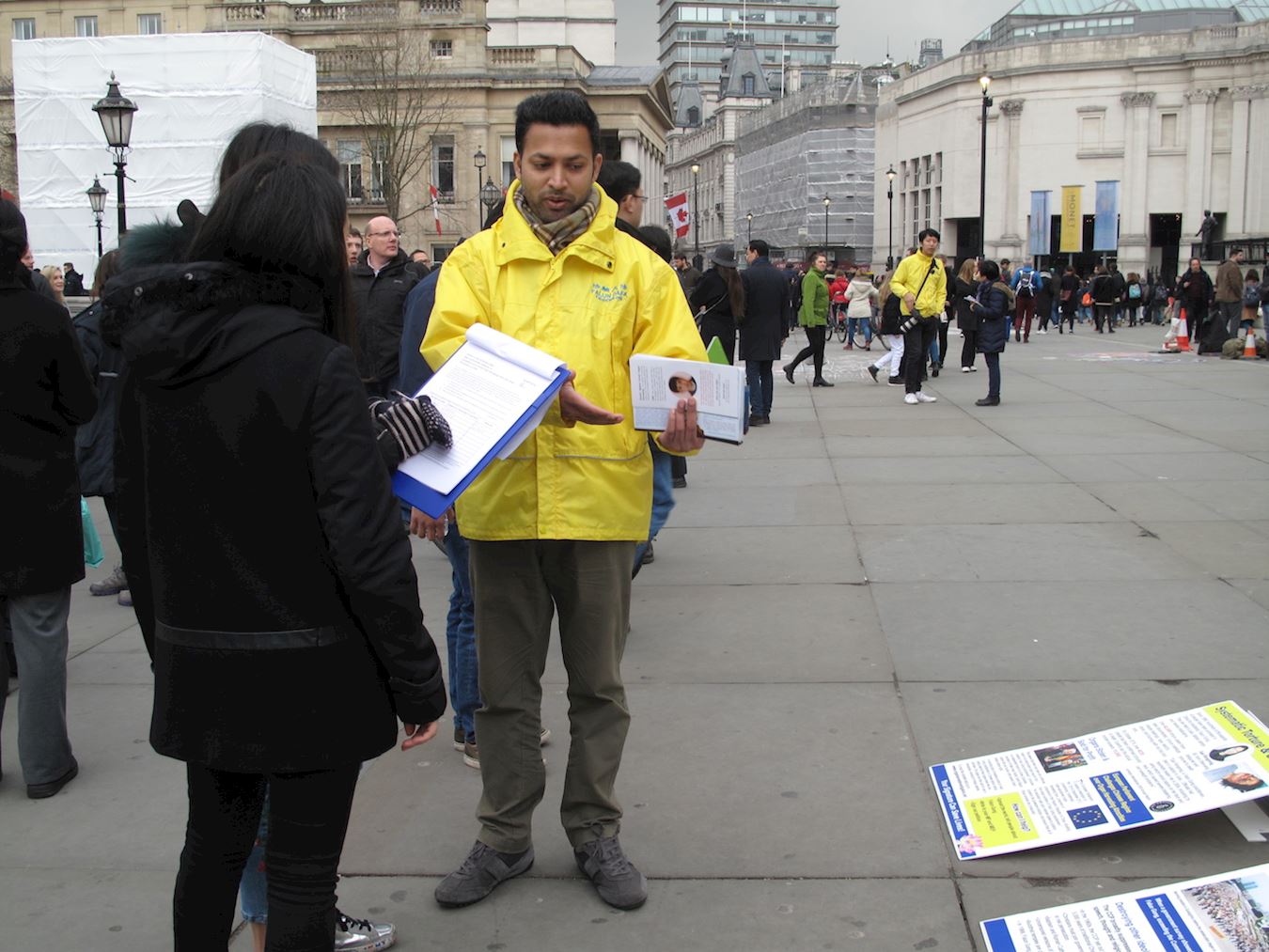 法轮功学员拉悉塔•森纳尼亚克(Lasitha Senanayake)多年来坚持周六在伦敦圣马丁广场讲真相反迫害,在当天庆祝三亿中国人三:退.活动中,他注意到很多人希望了解法轮大法是什么,于是他在讲真相过程中注重展示法轮大法的美好。