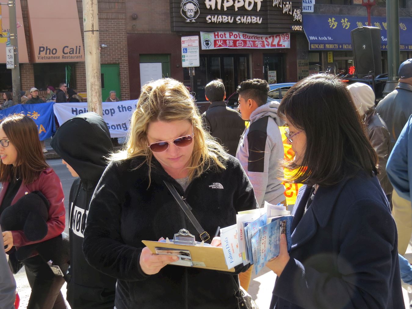 费城居民马克(Mark)与太太和女儿途径中国城时被集会所吸引,上前询问发生了什么。他们过去听说过法轮功学员因信仰在中国遭受的打压,因此夫妻俩都签名支持。他们的女儿也在一旁阅读相关的资料,并对法轮功学员信仰的“真善忍”原则表示赞同。