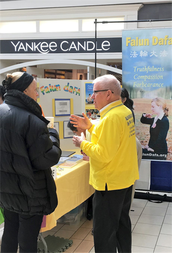 一位女士表示很想学功,学员向她介绍可以在网上下载教功录像、炼功音乐及大法书籍。还告诉她在附近的城市瑞得丁(Reading)镇即将举办免费讲座,介绍法轮大法并现场教功,欢迎参加。她听了后高兴的说,回去要和另一个朋友分享这个消息,让她也有机会学炼法轮功。