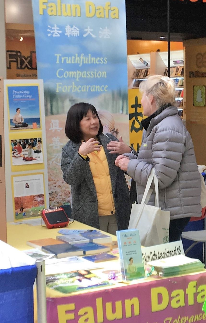 ![]() 图1~2:波士顿北岸购物中心举办的年度健康与健身博览会上,法轮功学员和民众交谈,介绍法轮功 |