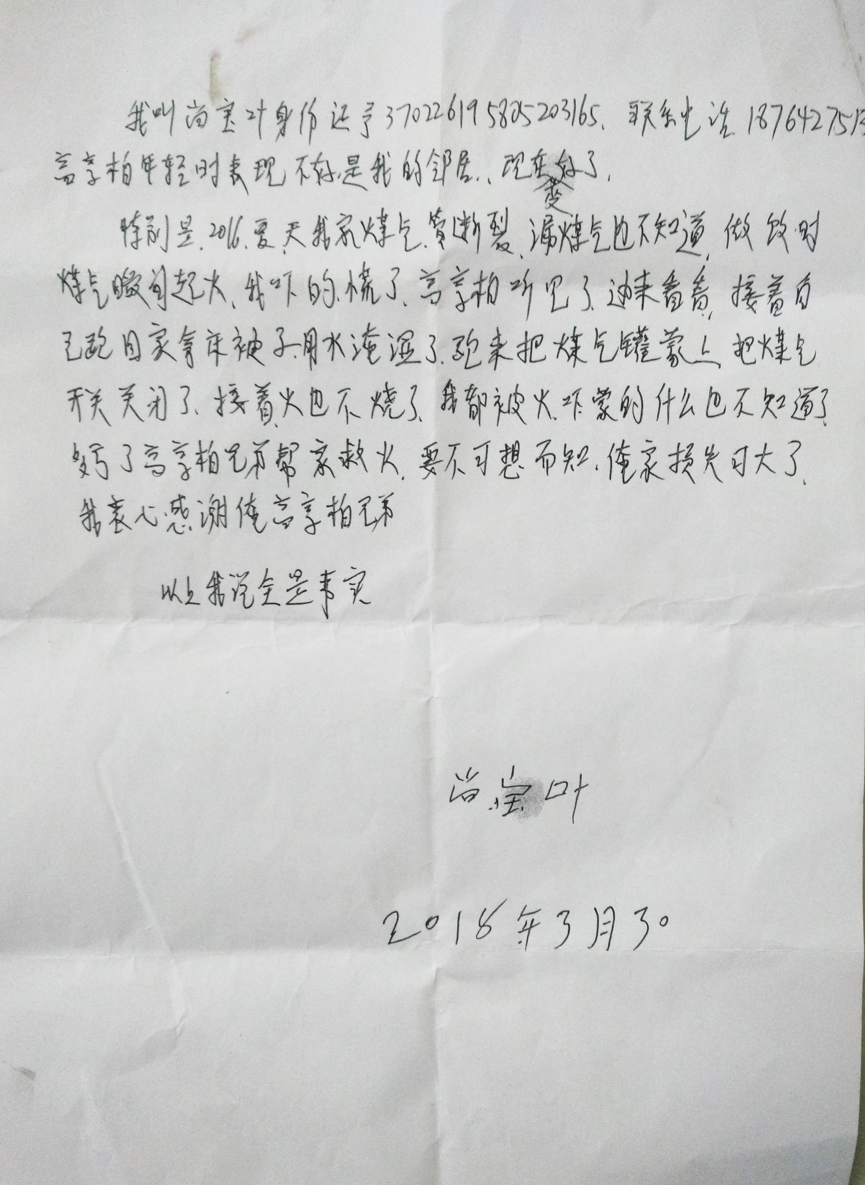 面对证言,公诉人也不得不承认高亨柏是一个有良知、见义勇为的人。二零一六年夏季的一天,高亨柏对面邻居家液化气管老化,着火了。邻居一家都慌了,怕液化气罐爆炸,吓得全都跑到街上,望着刚刚盖好装修好的新房,绝望的不知如何是好。正在家睡觉的高亨柏听到邻居的哭喊,忙跑出来,一看情况危急,马上回家顺手拿起女儿的被子,蘸满水,冲进邻居家的厨房,迅即用被子扑灭熊熊火焰,避免了一场大损失。