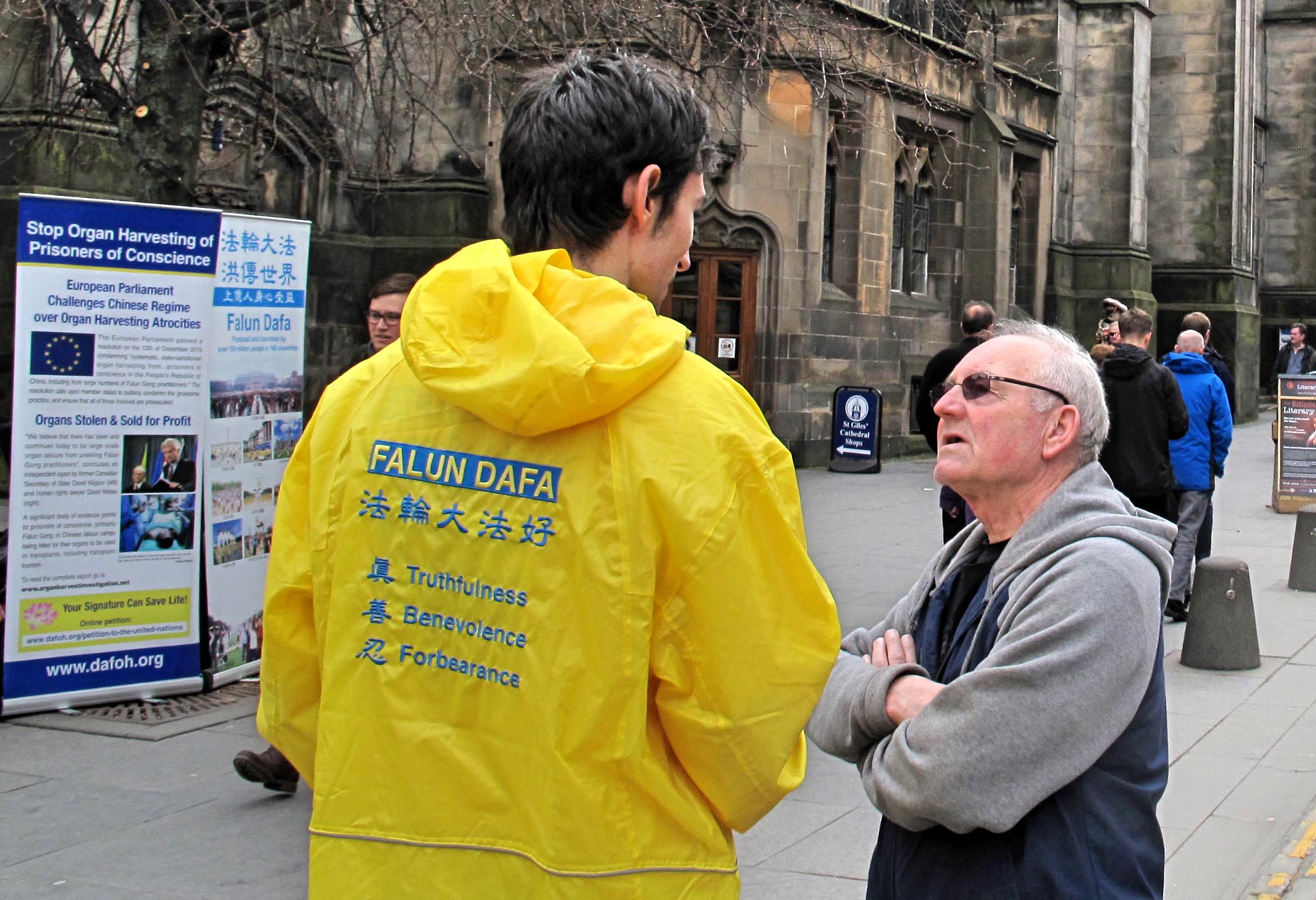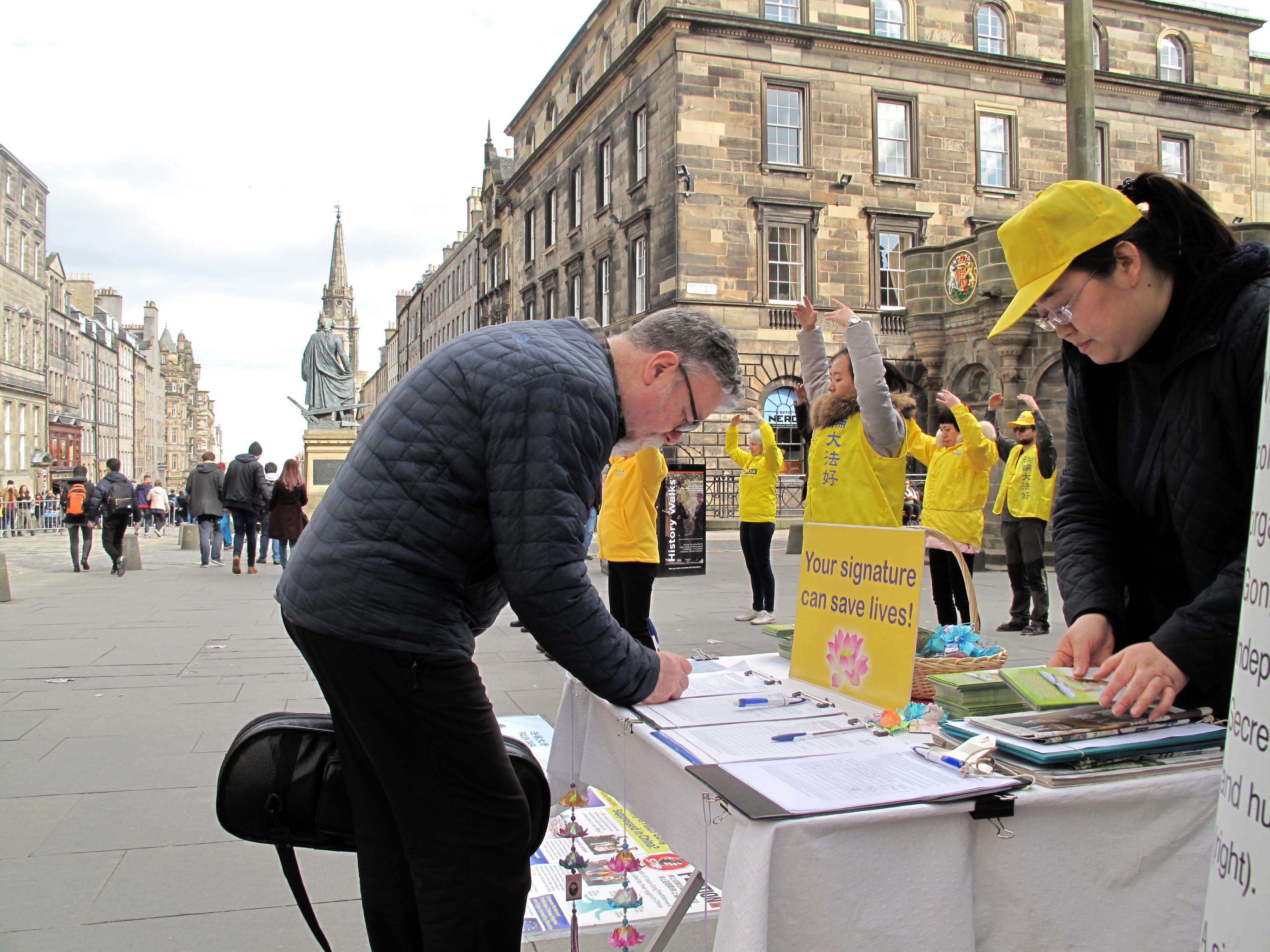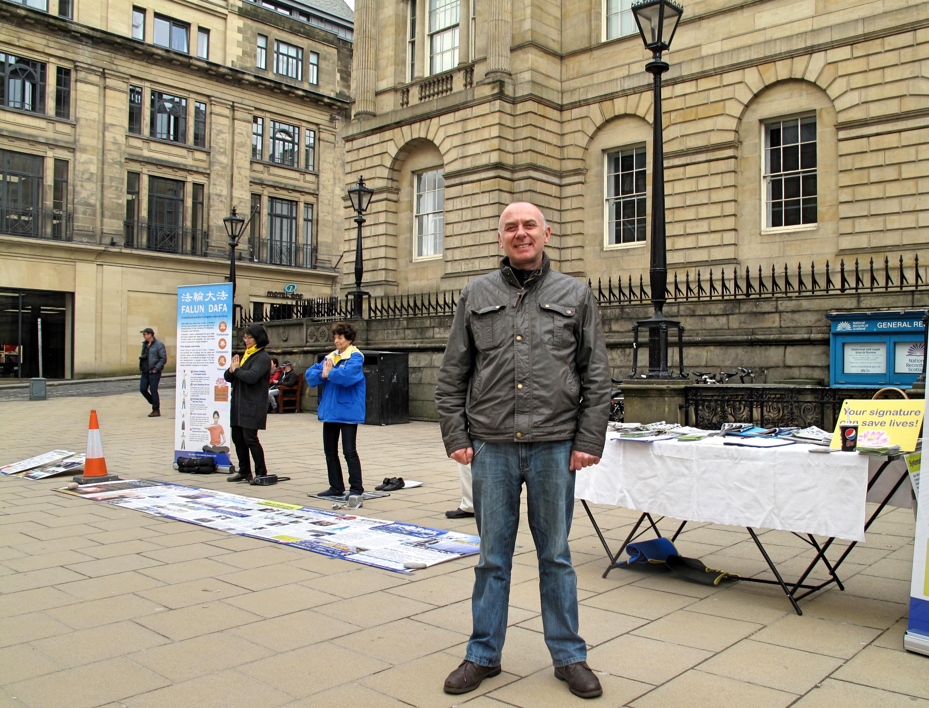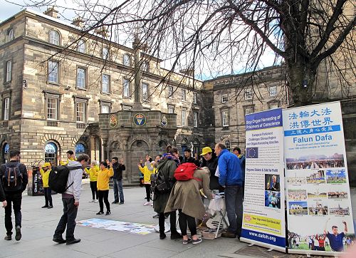一位男士原来在伦敦工作,经常经过中共驻伦敦大使馆,了解法轮功,现在在爱丁堡工作,看到法轮功学员,很惊喜,要去当地炼功点学炼法轮功。
