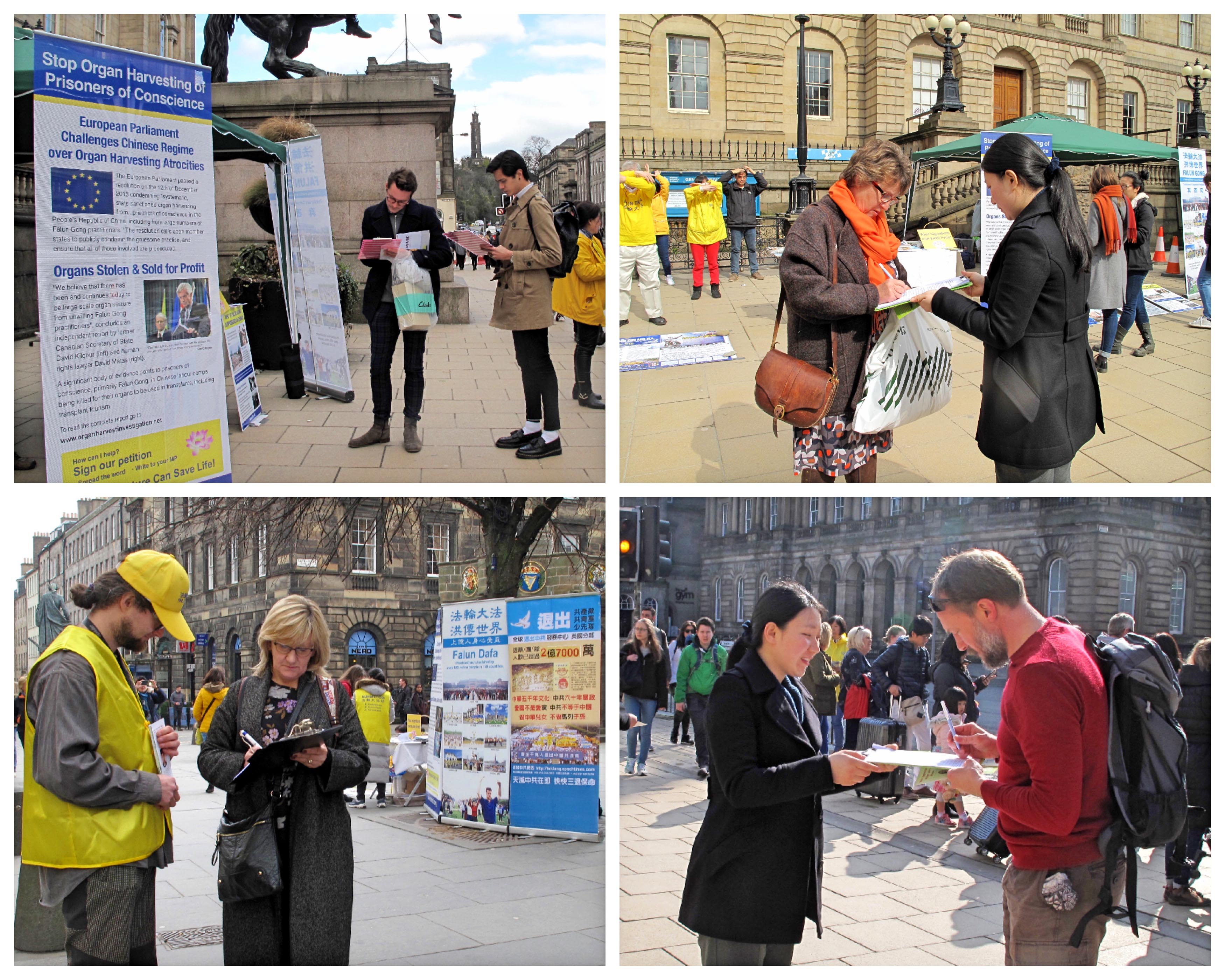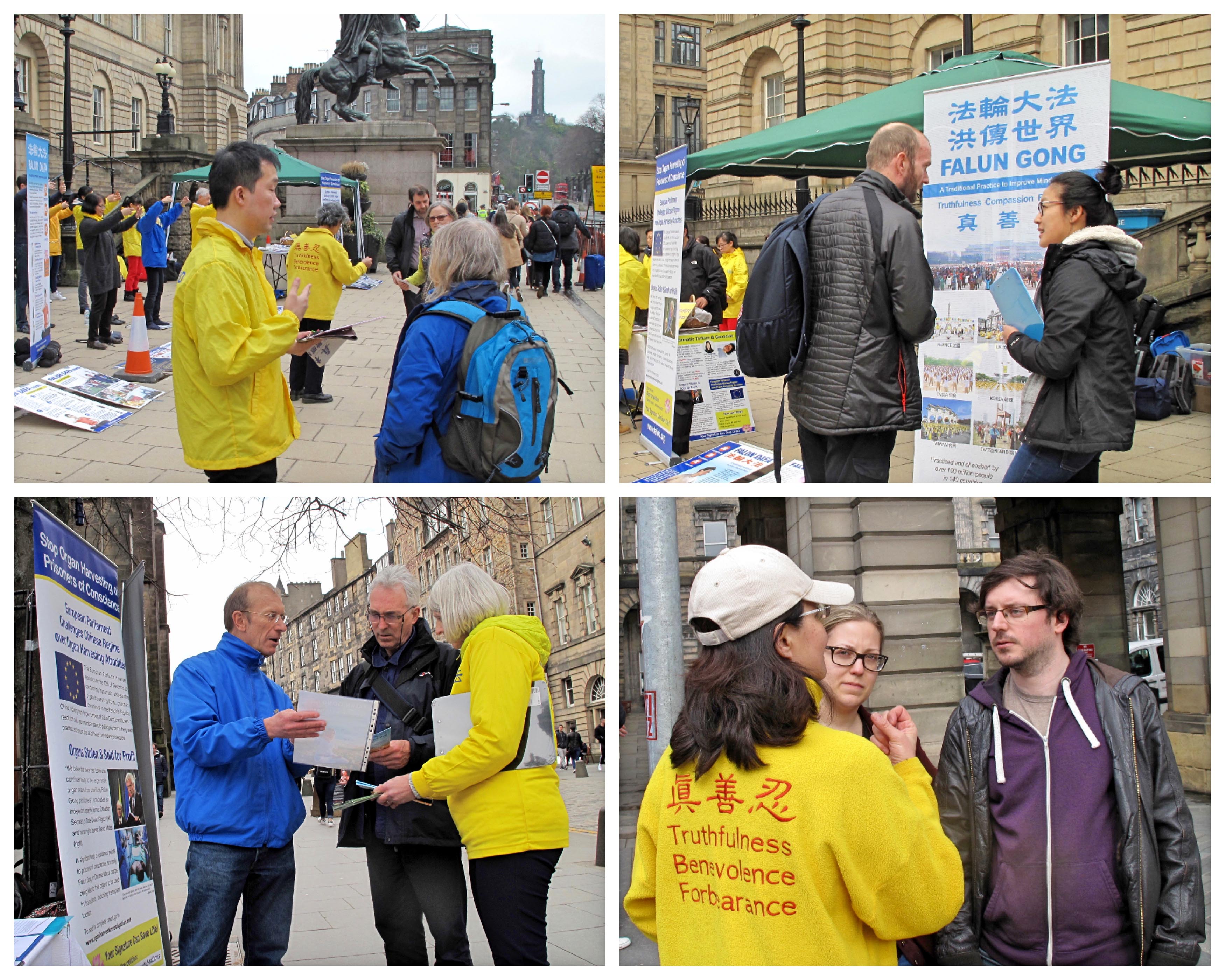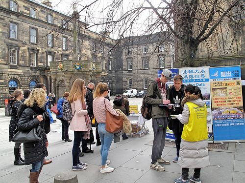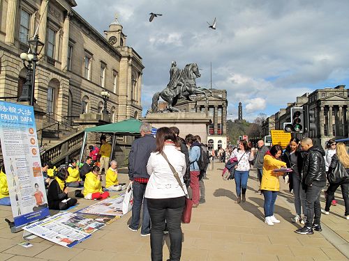 活动当天,爱丁堡一改持续多日的阴雨天气,呈现一派温暖和煦的春日景象,好天气把熙熙攘攘的人流带到皇家大道和王子大街,带到法轮功学员和法轮功真相信息面前。
