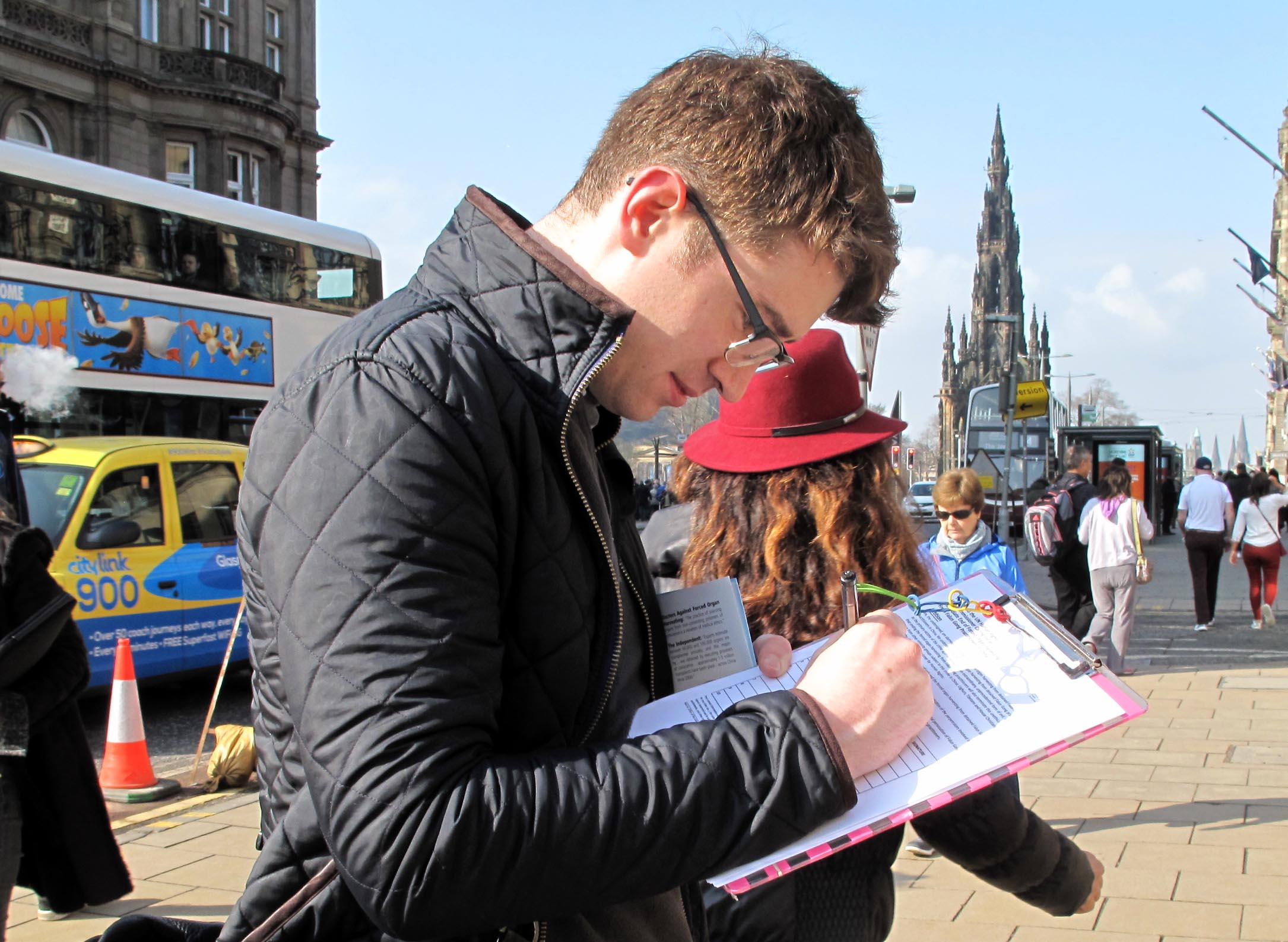 当天在爱丁堡王子大街( Prince Street)圣杰姆斯广场(St James Square)第一个在要求中共停止活摘器官征签表上签名的是苏格兰青年麦克兰•卡特(Mclain Carter),他路径法轮功学员讲真相活动场地时,主动找法轮功学员要传单。他介绍说自己刚刚大学毕业并开始新工作,大学所学专业是历史和宗教,知道中共迫害法轮功,他要把关于法轮功的真相信息带到自己的新工作里去讲:“我要更多的去了解,我要让更多人知道。”