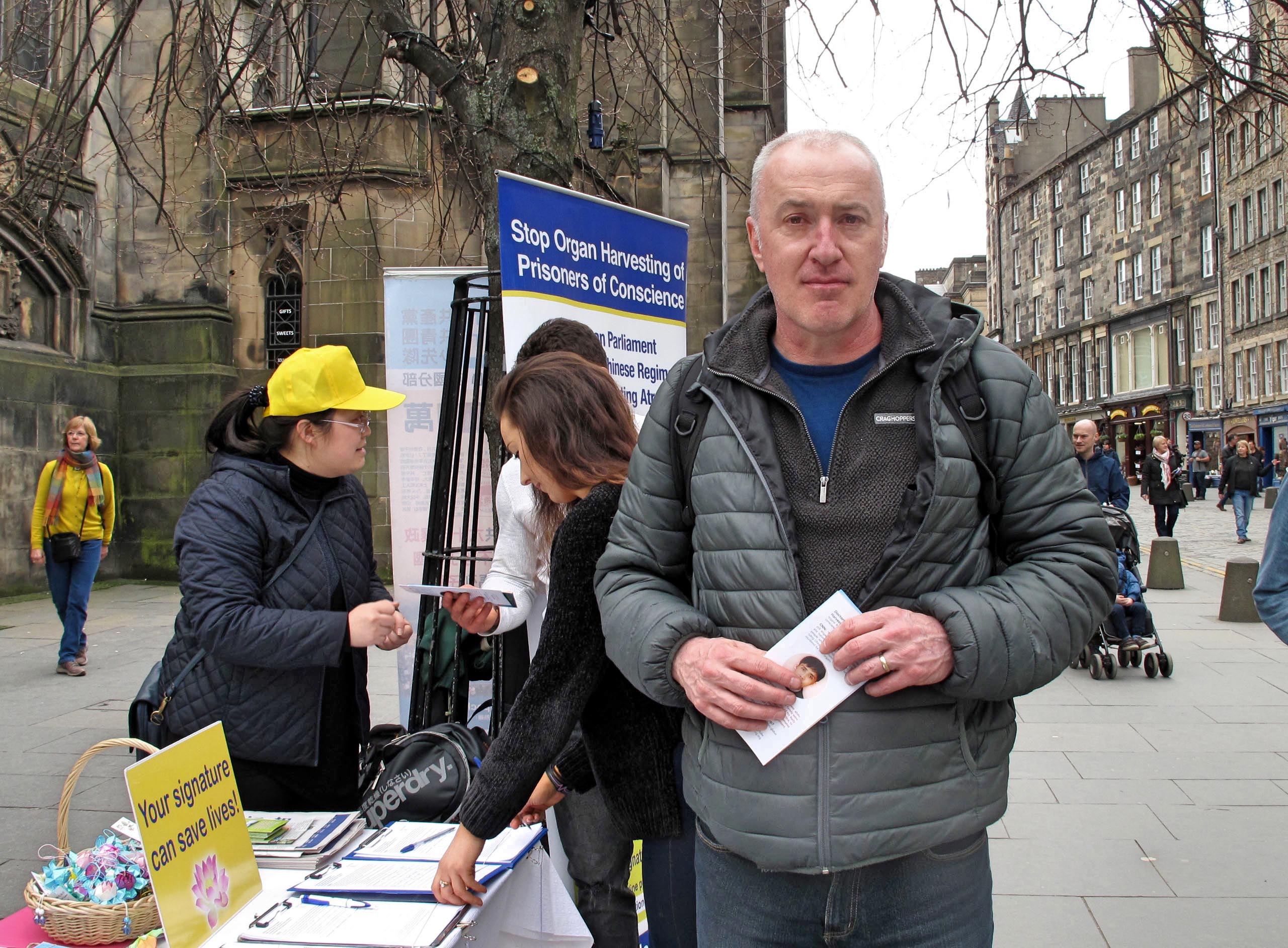 爱丁堡人罗伊(Ronnie)是个食品业供货商,当日在国王大道第一次听说法轮功,中共活摘器官罪行让他震惊,他表示法轮功学员正在传递的信息要让全世界知道:“我坚决反对迫害,这个(活摘器官罪行)决不能被接受。”“要让全世界知道这个(真相),你们现在做得很好,媒体应该报道。”“让人们知道这个很重要,一步步来,你们(法轮功)要继续下去。”