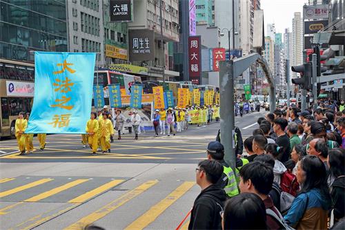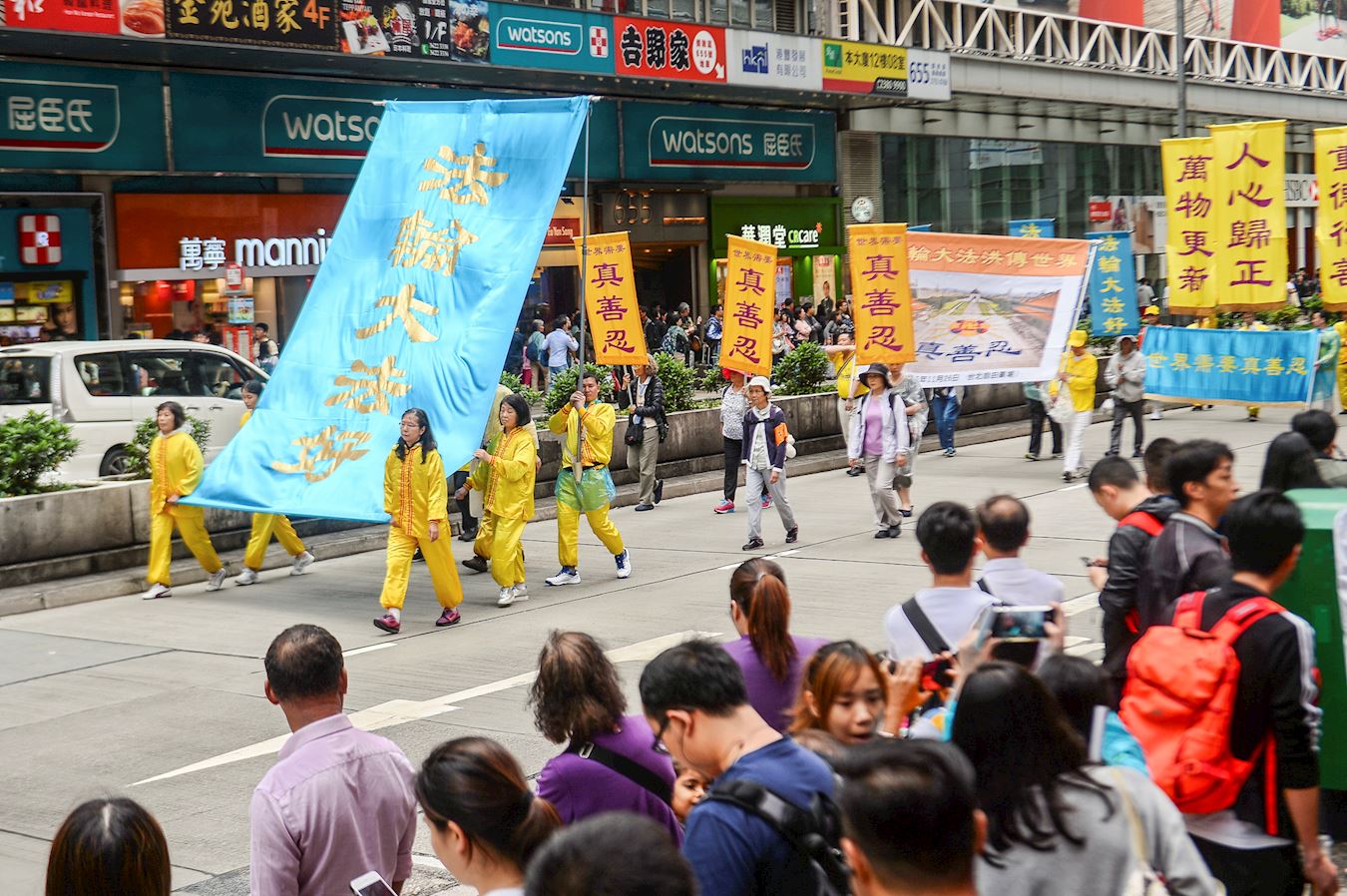 下午天气转好雨也停,约一时半,近千人的游行队伍在天国乐团的领头下从长沙湾游乐场出发,游行分六大方阵,包括“解体中共 复兴中华”、“法轮大法洪传世界”、“和平理性反迫害”、“天灭中共 三:退.是福”等,各式大型幡旗气势浩荡,并有功法展示队、退!党!队、花车、花船队、腰鼓队、旗鼓队沿途表演。