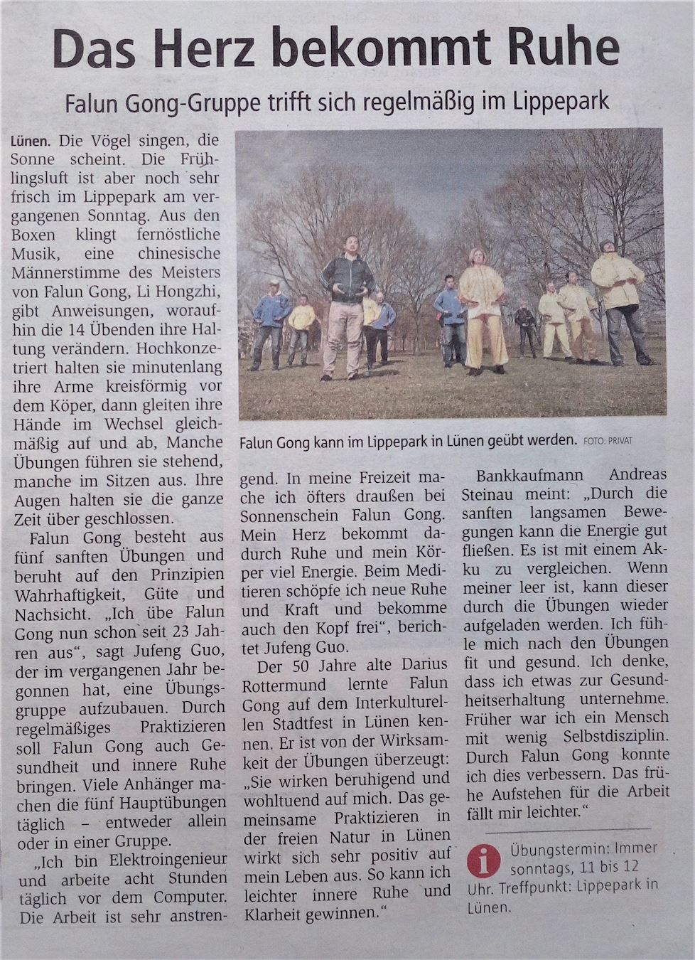 ![]() 图:三月三十一日,德国《周末信使报》报道法轮功学员在绿嫩市丽波公园集体炼功。 |