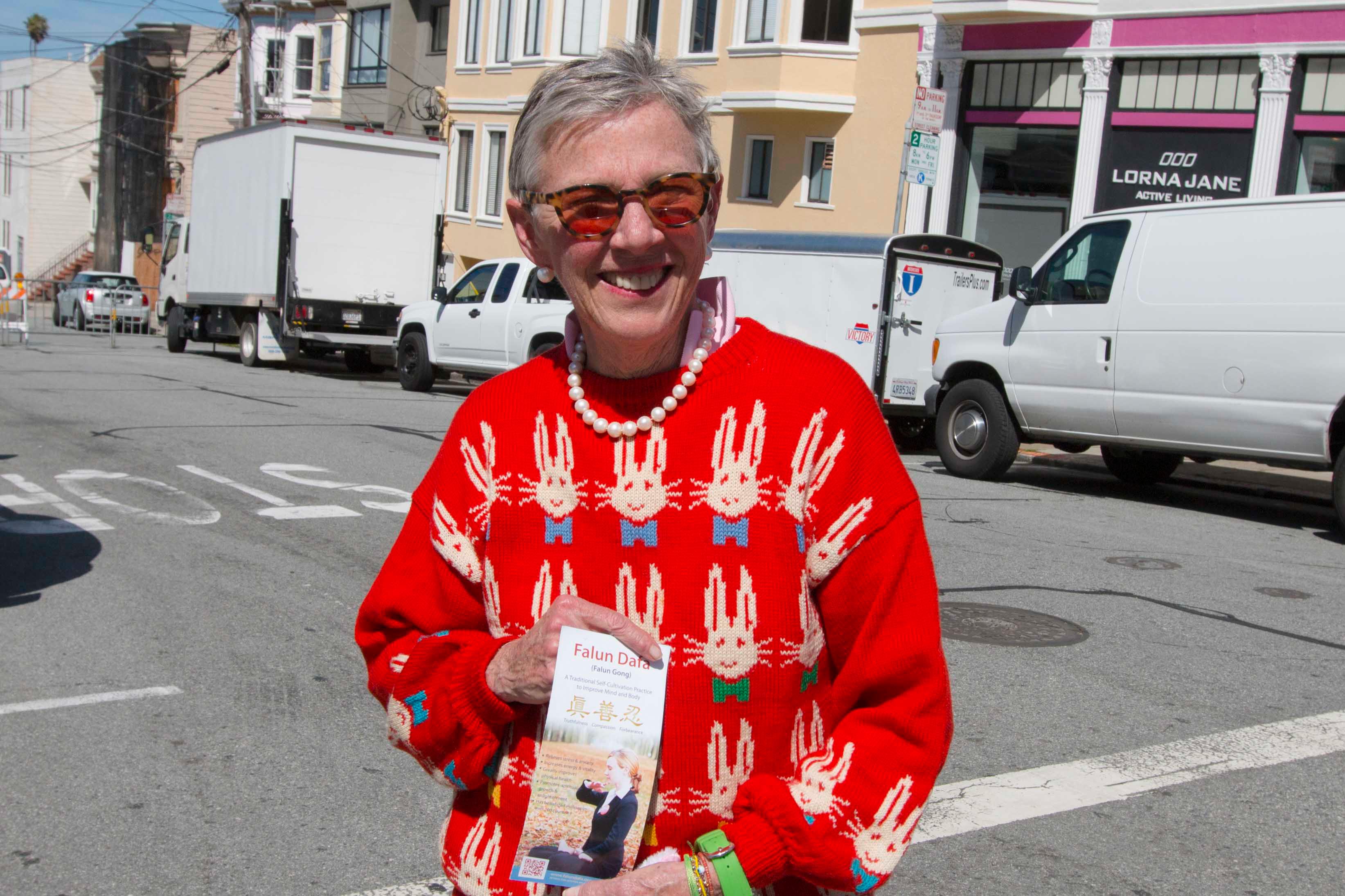 游行主办者、旧金山联合街区协会主席埃莉诺•卡彭特(Eleanor Carpenter)非常感谢法轮功学员参加旧金山复活节游行。她说:“法轮功的队伍是整个游行队伍中最棒的,无可比拟。我们非常感谢法轮功学员再次参加复活节游行。他们的参加让我们深感自豪。”她看着法轮功真相小册子说,作为生意人,她常感到压力,她需要炼法轮功,减缓压力。