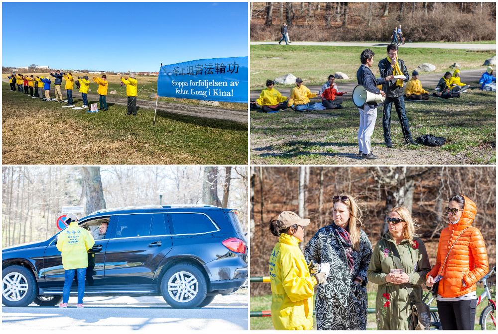 过往的车辆经过学员的活动场地时,大多都是放慢速度、缓缓驶过或鸣笛以表支持。有的遥下车窗索取真相资料,主动和学员交谈来了解真相,有很多了解了真相的瑞典人对法轮功学员十几年来这种和平的抗议行动表示敬佩和赞赏,有人不停地拍照或竖起大拇指称赞法轮功学员“做得好!”