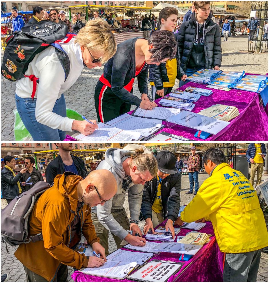 有两位瑞典中年男士一直在专注的听法轮功学员托比亚斯、温纳、杰森,他们透过扬声器用英、瑞文向来自世界各地的民众讲述四·二五经过和背景,揭露中共迫害法轮功学员以及活摘法轮功学员器官的罪恶,同时介绍三:退.(退!党!、退*团-、退*队-)大潮。两位先生听明白了真相后,主动走过来签字,表示支持法轮功学员反迫害,还对学员说:“真没想到中共这么坏啊!如果你们不把这些事(活摘器官)揭露出来,正常人简直是想象不到、不敢相信的。”