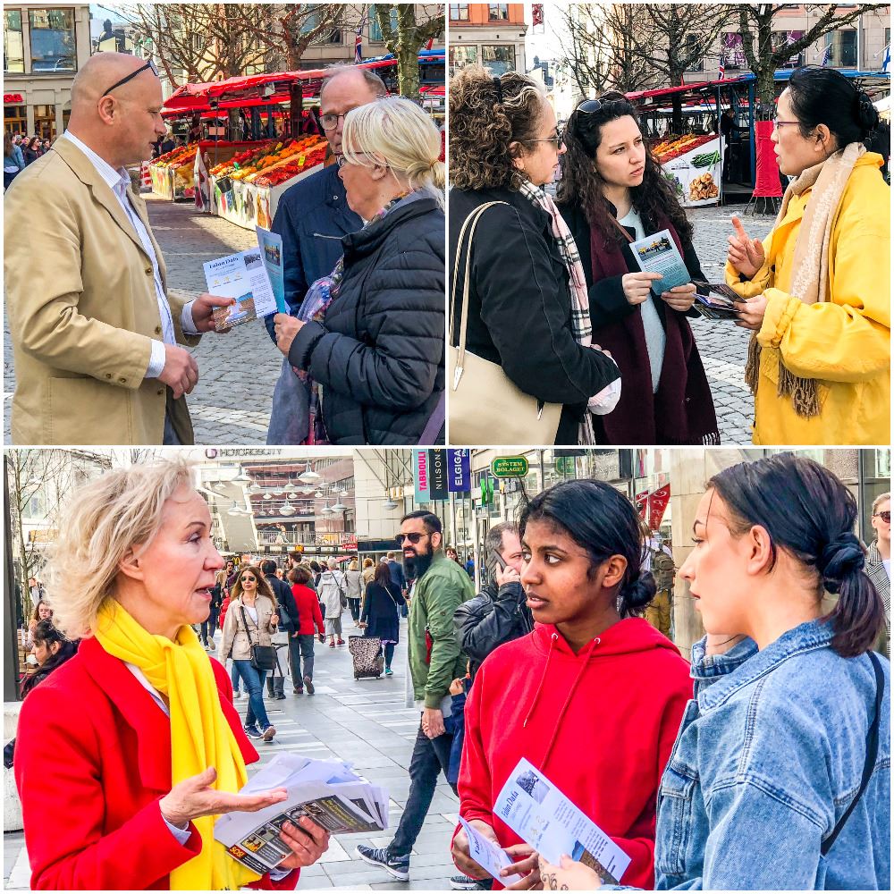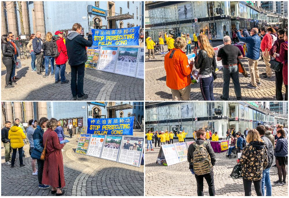 ![]() 图3:法轮功学员在斯德哥尔摩市中心Hötorget地铁站附近的音乐厅(Konserthuset)旁向人们面对面介绍法轮功、讲述四·二五经过和背景,揭露中共迫害法轮功学员以及活摘法轮功学员器官的罪恶 |
