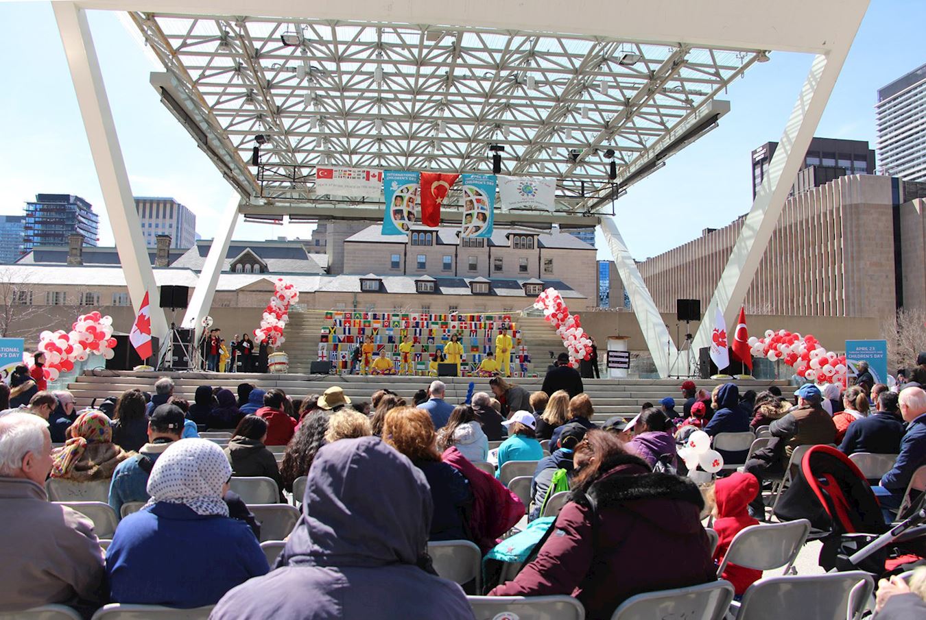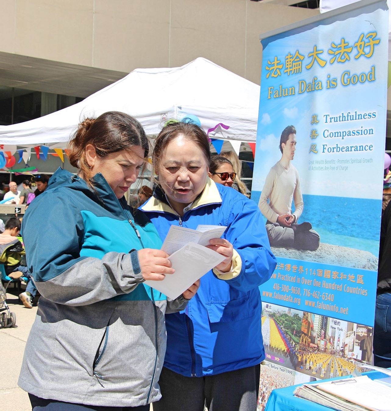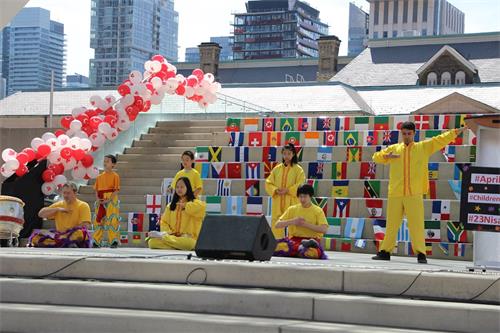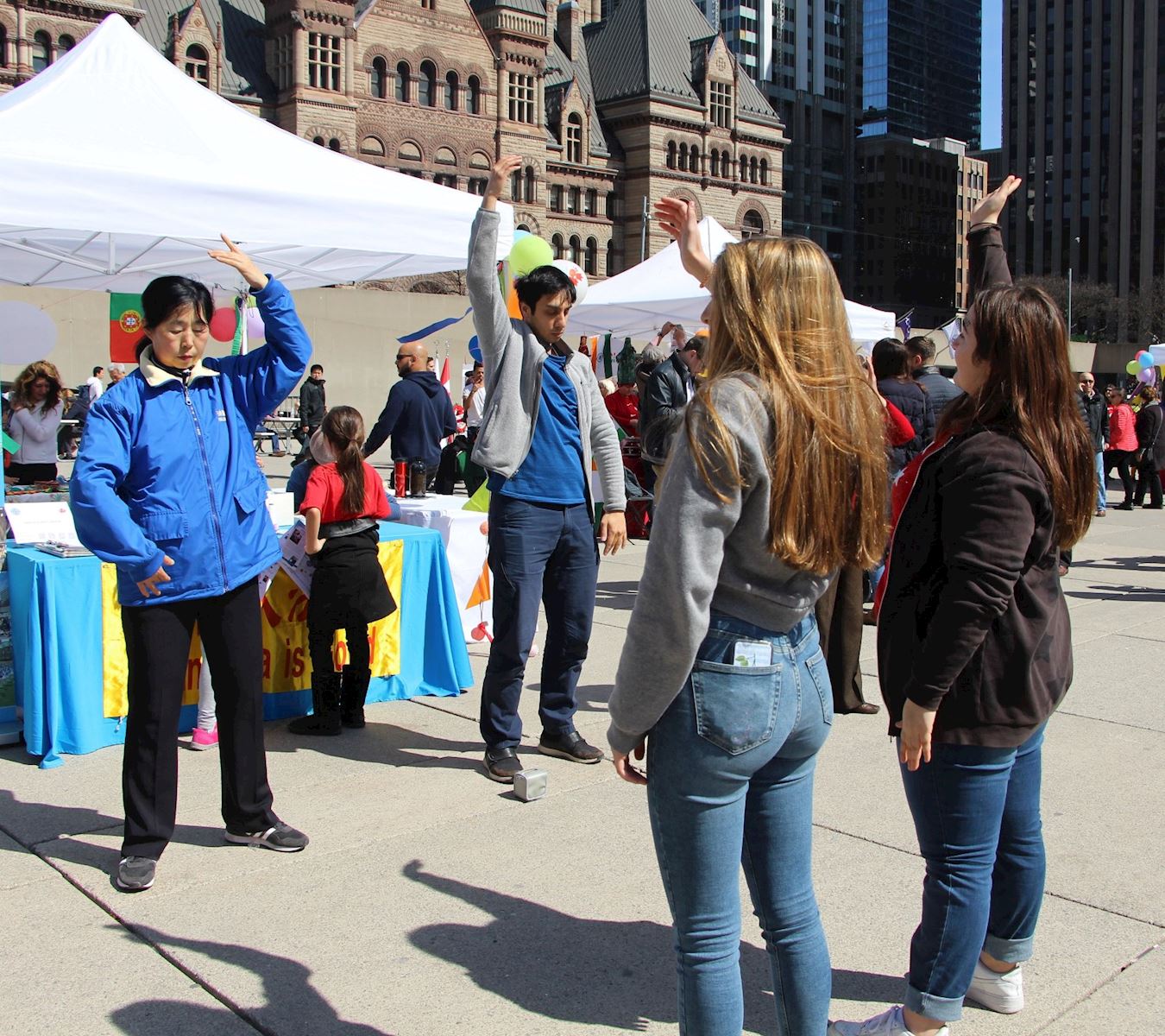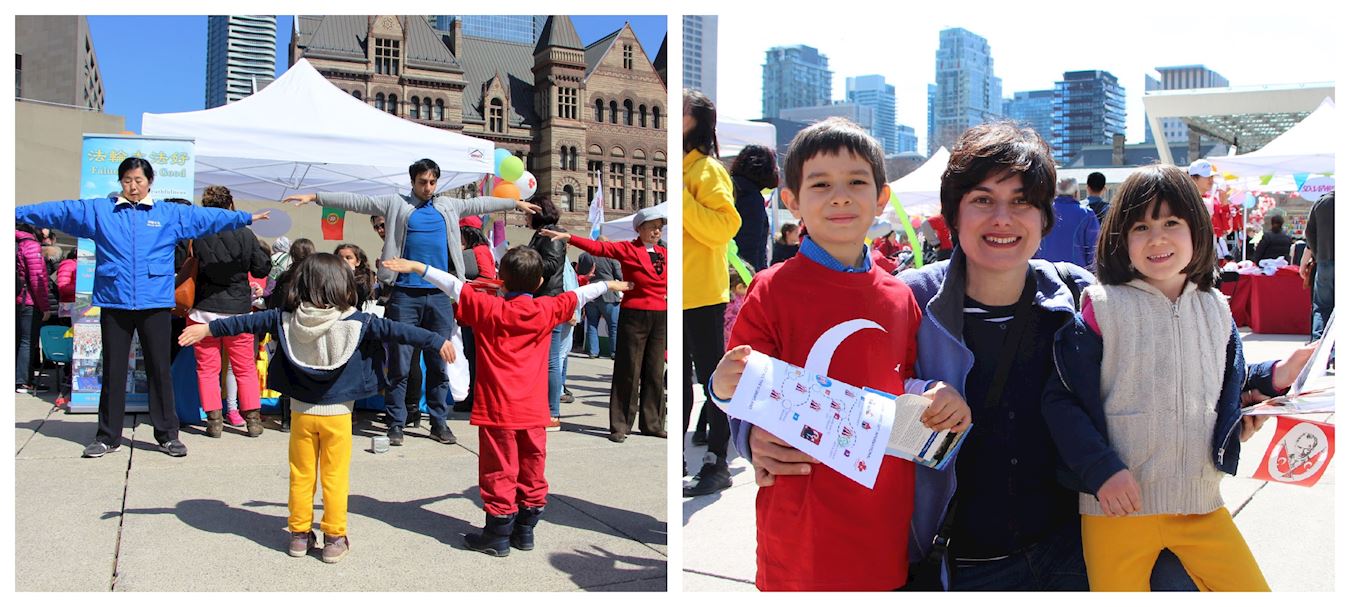 当天,来自不同文化背景的孩子们相聚一堂,用娱乐节目、民族舞蹈和民俗音乐来庆祝土耳其国际儿童节。多伦多法轮功学员每年都应邀参加这个活动,他们有莲花艺术团的舞狮队和功法演示,还有法轮功的展位,很多观众看完表演后来到法轮功的展位来学功和索取资料。有的现场学炼法轮功功法,有的表示能量场很强,有的在“停止中共活摘法轮功学员器官”的征签表上签名,有的留下联系电话表示要参加炼功点。