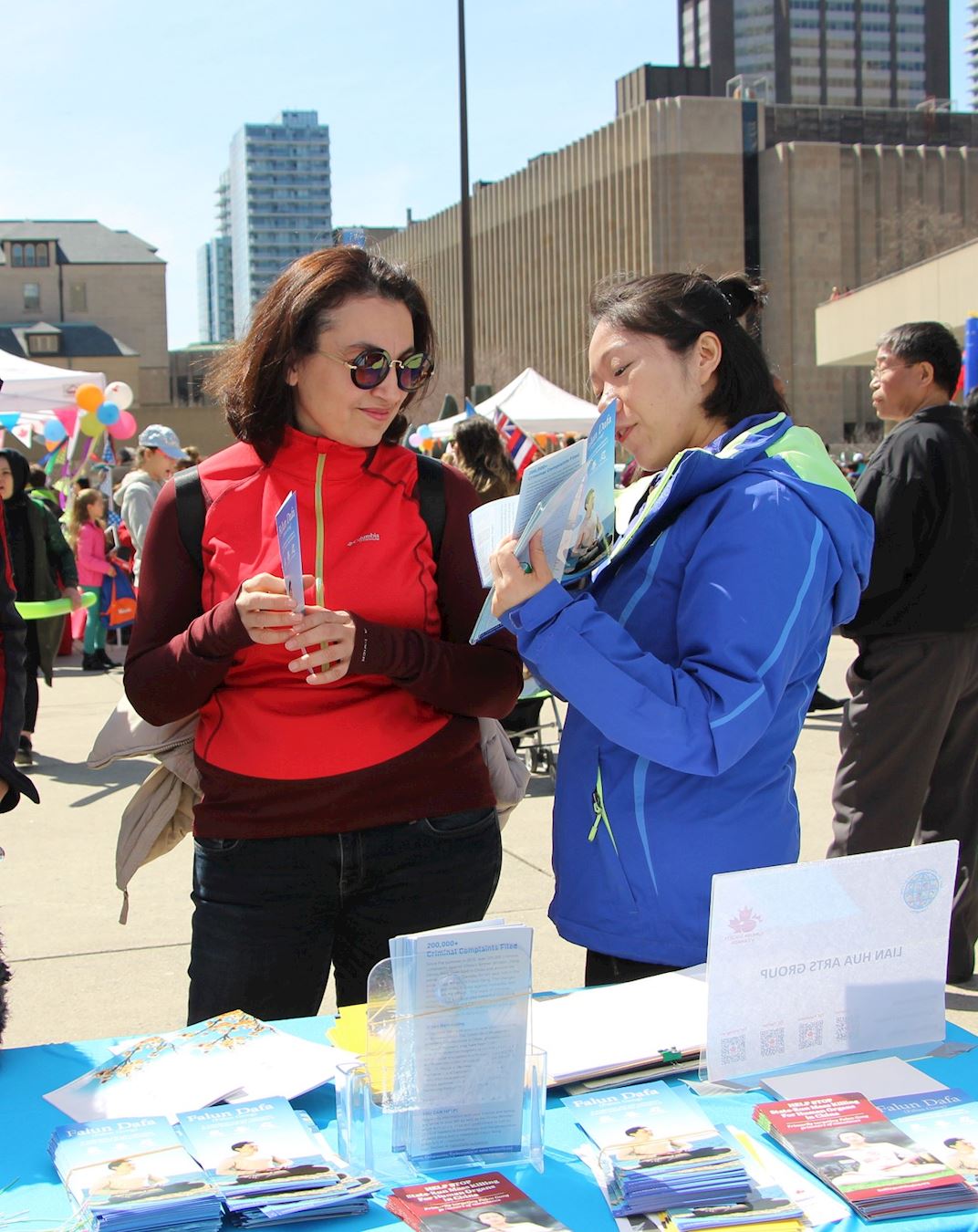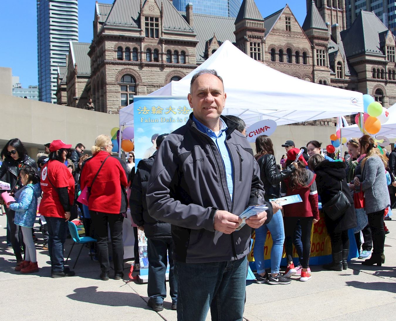 做电脑销售工作的多伦多居民亚维德斯(Avedis)是土耳其族裔,他在法轮功展位上询问了很长时间和了解了很多情况,他接受采访时说:“我今天是第一次听到和看到法轮大法这个功法,我对此非常感兴趣,就觉得要多了解,非常祥和的一个功法,非常感谢今天能在此遇上,让我知道了这么多的信息。我会回去更详细的阅读和学习。”