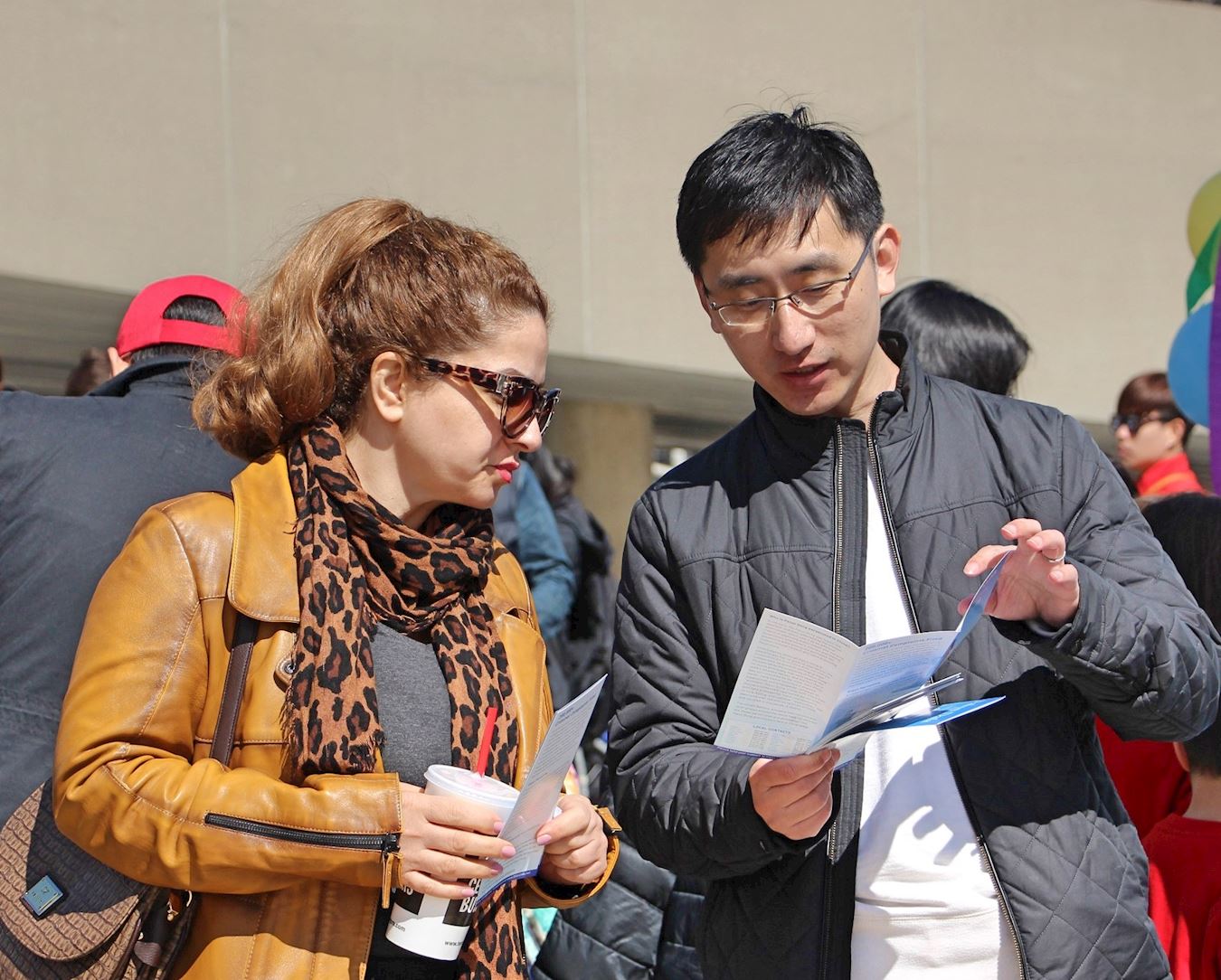法轮功学员毛女士说:“现在很多中国人都非常清楚中共的邪恶,一讲三:退.的意义都很快明白,下午的两小时,我就给十二位中国人做了三:退.。一位来自广西的石女士带着十二岁的女儿来参加活动,她最后用真名做了三:退.。两位来自北京和福建的女士都是用真名做了三:退.。她们都非常感谢法轮功。退!党!大潮真的是势不可挡,随时随地都有人在三:退.。”