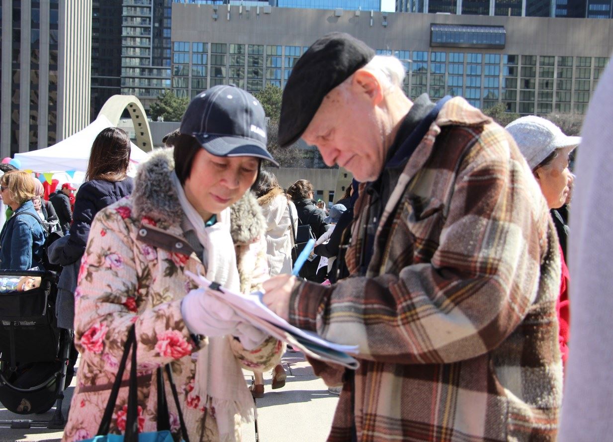 ![]() 图7:了解真相的民众在征签表上签名,制止迫害法轮功。 |