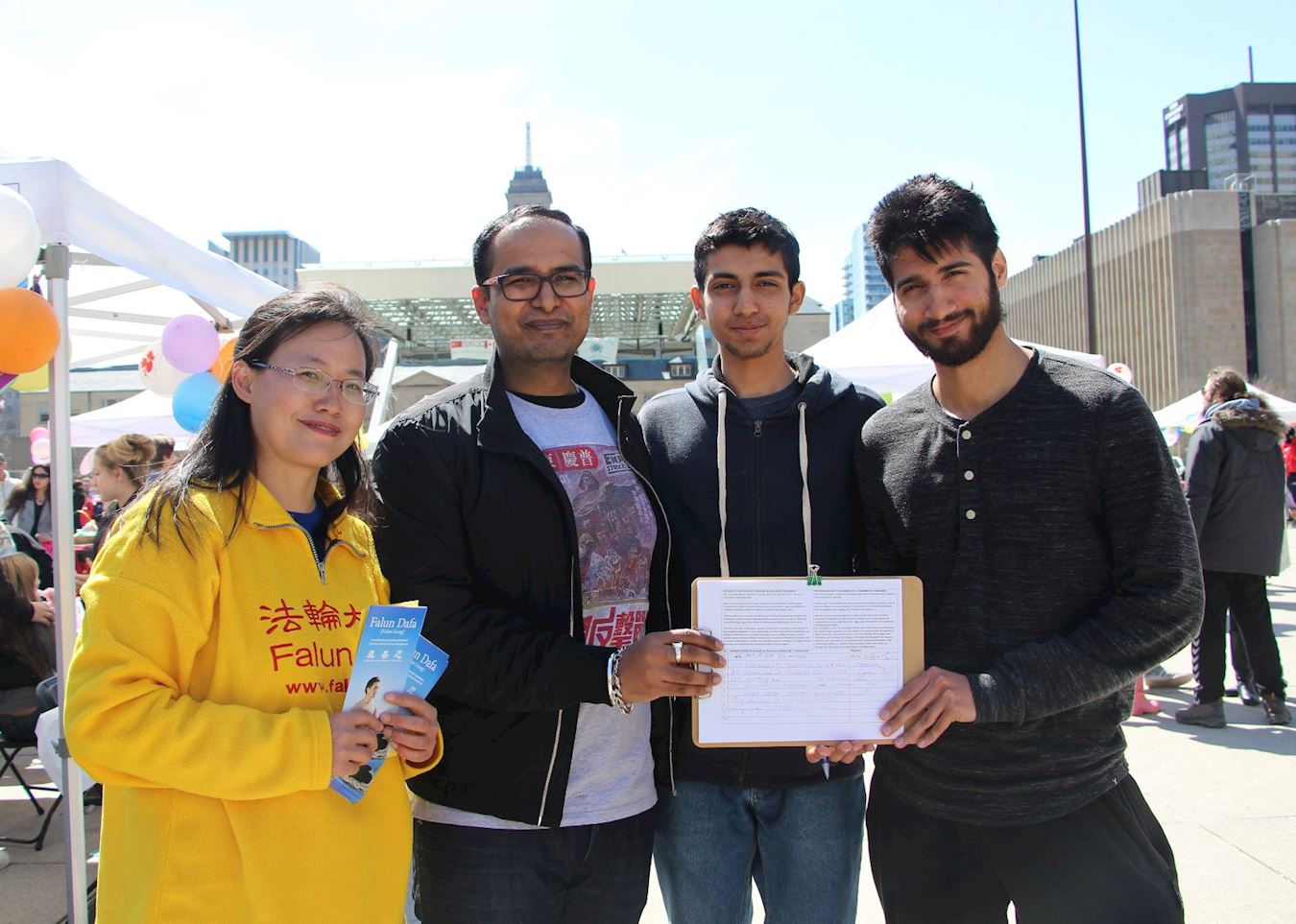 印度族裔的留学生杰伊(Jay)和同学一起参加了今天的活动,他跟他的两位同学毫不犹豫的在“制止中共活摘法轮功学员器官”的征签表上签了名。他拿着征签表说:“我们要把这个征签表发布出去,让更多的人来制止这场迫害!”